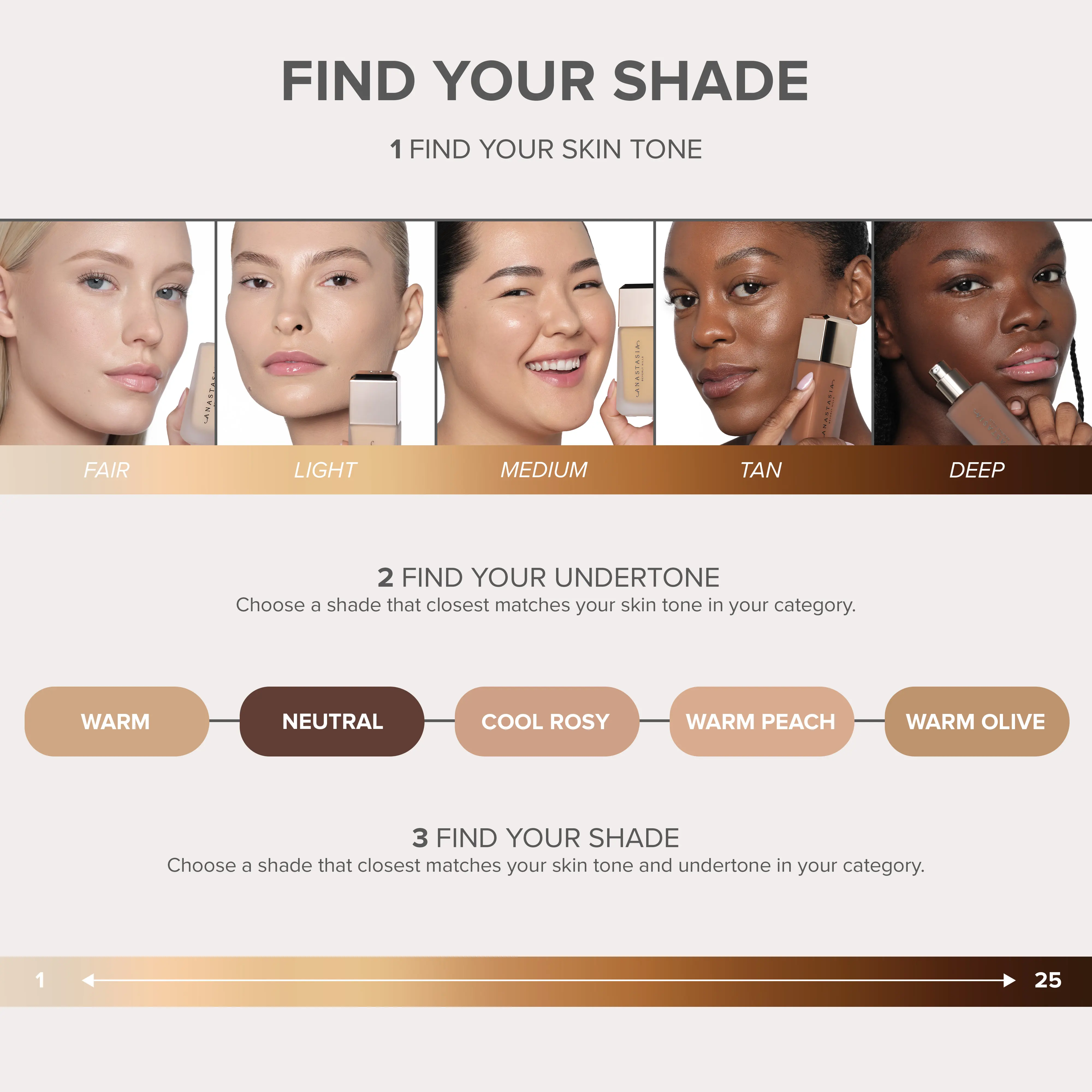 Choose a shade that closest matches your skin tone in your category. Select from Warm, Neutral, Cool Rosy, Warm Peach + Warm Olive undertones.