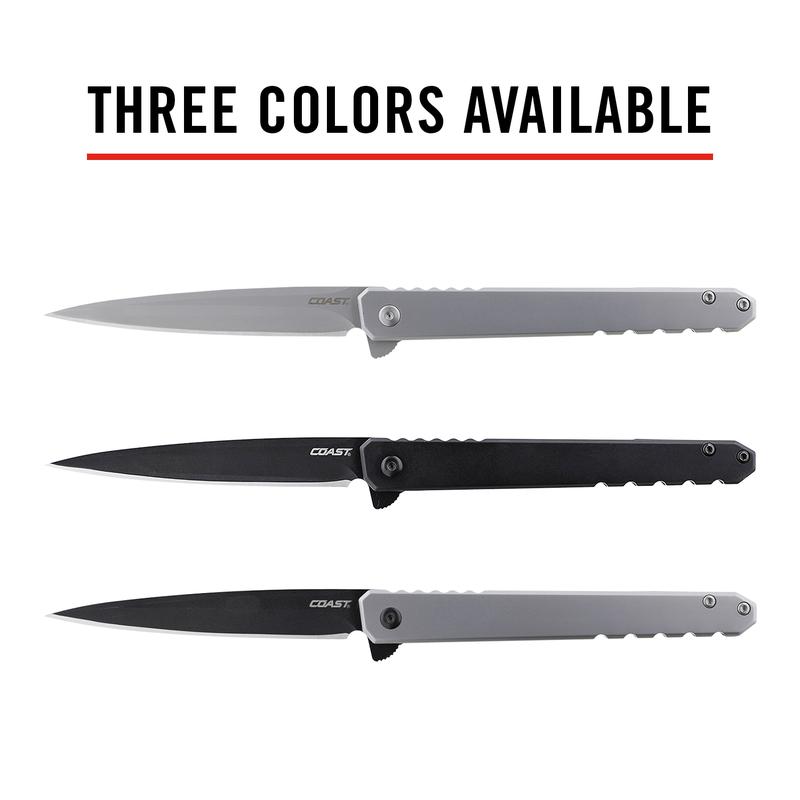 Make a point of effortless looks. Styled like a stiletto, the Origin knife from our Founder’s Collection recalls the efficiency of COAST's earliest designs—with a sleek silhouette and all-metal construction for everyday durability and precision in the hand. The 3.5-inch, drop-point dagger-style blade, constructed of 9Cr18Mov steel with a glass-bead finish, flips open by the finger tab and is secured by a frame lock when in use—so that you’re safe no matter whether you’re opening a letter or cutting through a rope. The stainless steel pocket clip makes for easy everyday carry. Equally, at home on the avenue or out for an adventure, this go-getting knife enhances your everyday wear. Available in three colors, certain models feature a black titanium nitride blade coating for wear resistance. The Origin knife is backed by COAST’s lifetime warranty.