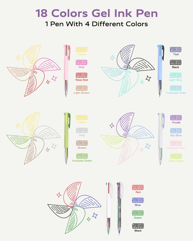 Β·Variety of Colors: These colored pens features 18 different ink colors: black, blue, red, green, purple, macaron pink, sky blue, olive green, avocado green, brown, gray, yellow, pink, light brown, rose red, teal, turquoise, and light blue