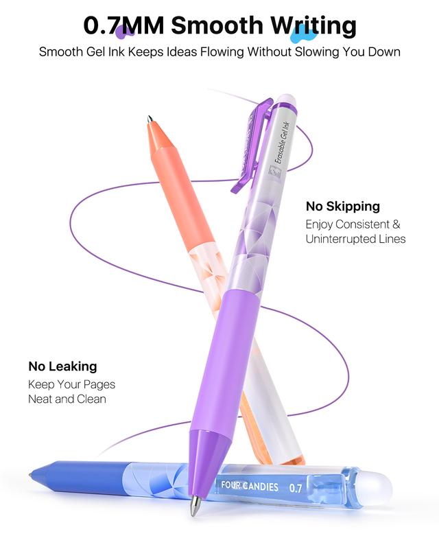 ·Variety of Colors: This 12-pack of Four Candies erasable multicolor pens includes classic black and blue as well as vibrant pink, purple, and green. The bold, vivid ink makes your notes, planners, and journals stand out