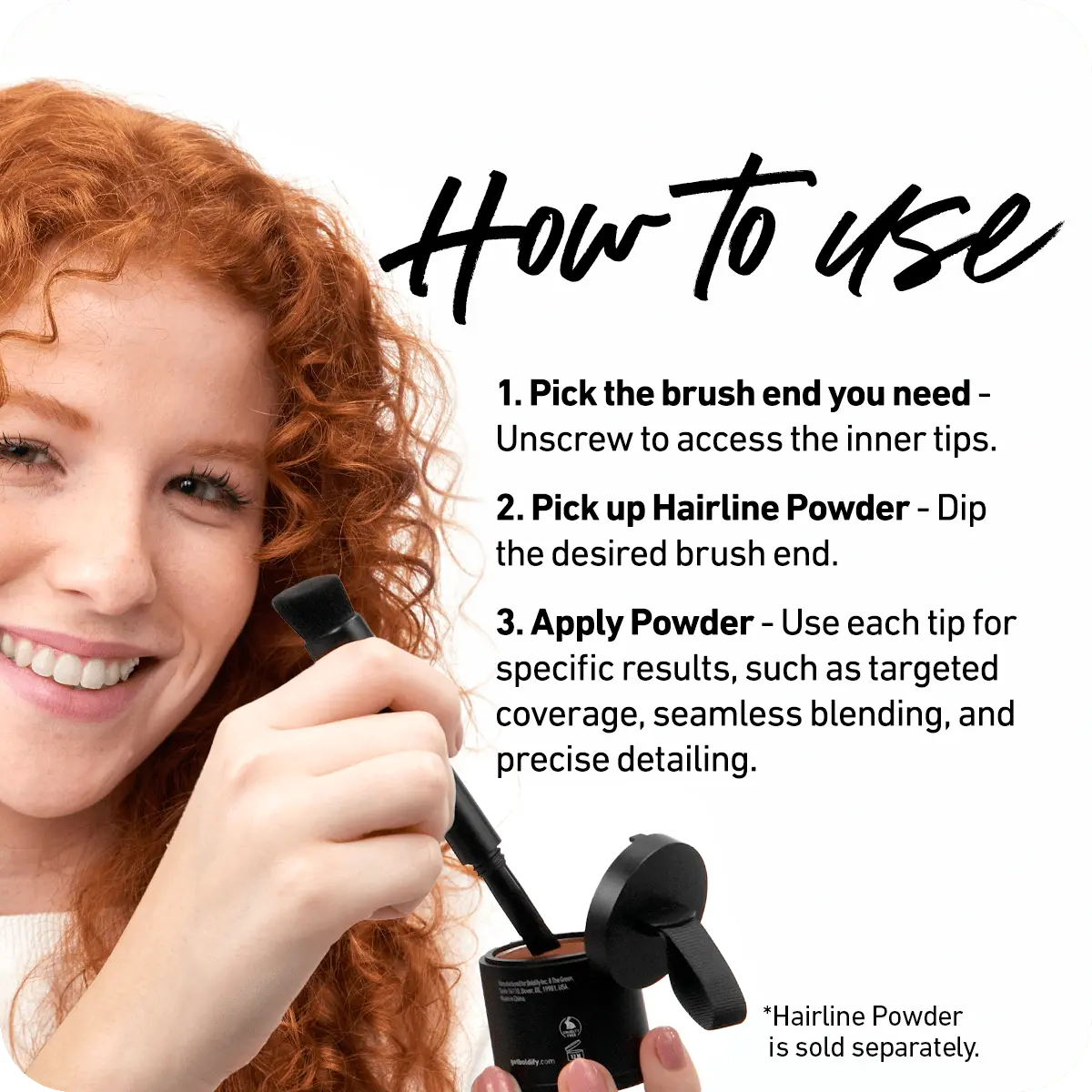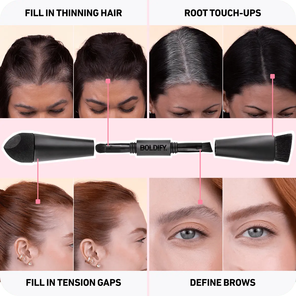 The Boldify Four-Ended Hairline Powder Brush is your ultimate tool for precise and versatile styling. With a sponge tip for targeted application, angled brushes for seamless blending, and a detailed inner brush for polished finishes, this 4-in-1 design ensures flawless coverage on hairlines, roots, brows, and beards. Crafted with high-quality, vegan, and hypoallergenic materials, it’s the perfect compact companion for effortless touchups at home or on the go.