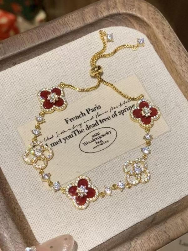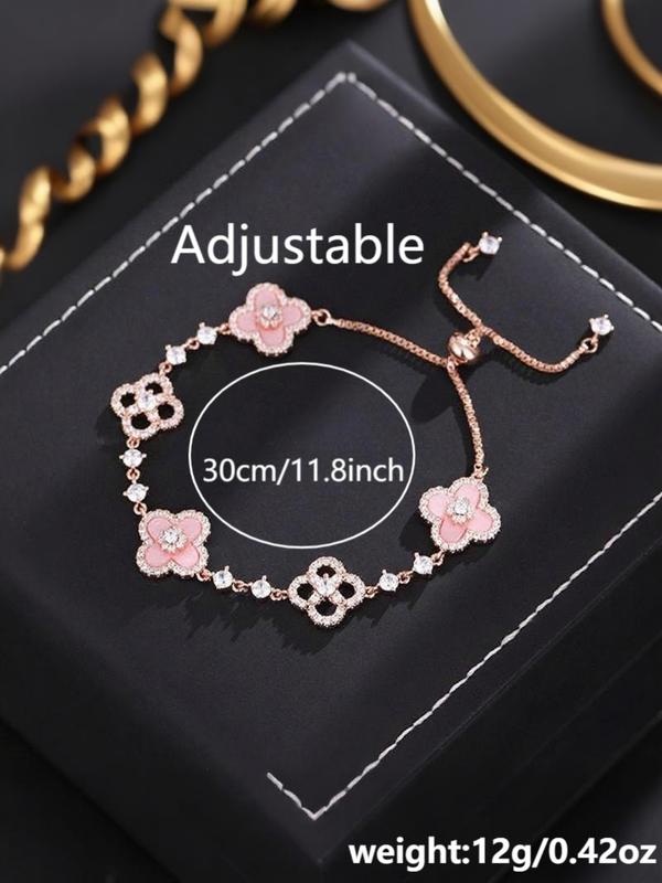 Women's Four-Leaf Clover Bracelet with Sparkling Quartz, Adjustable Allergy-Free Waterproof Design, Rose Option Available, Flower Design Bracelet
