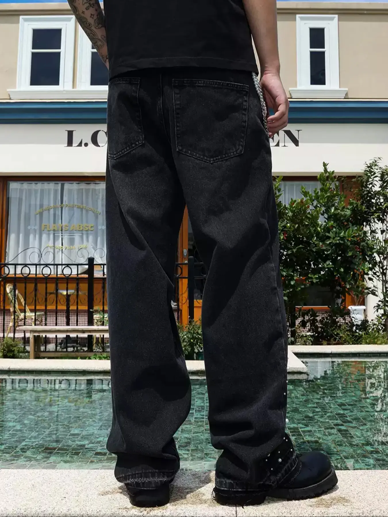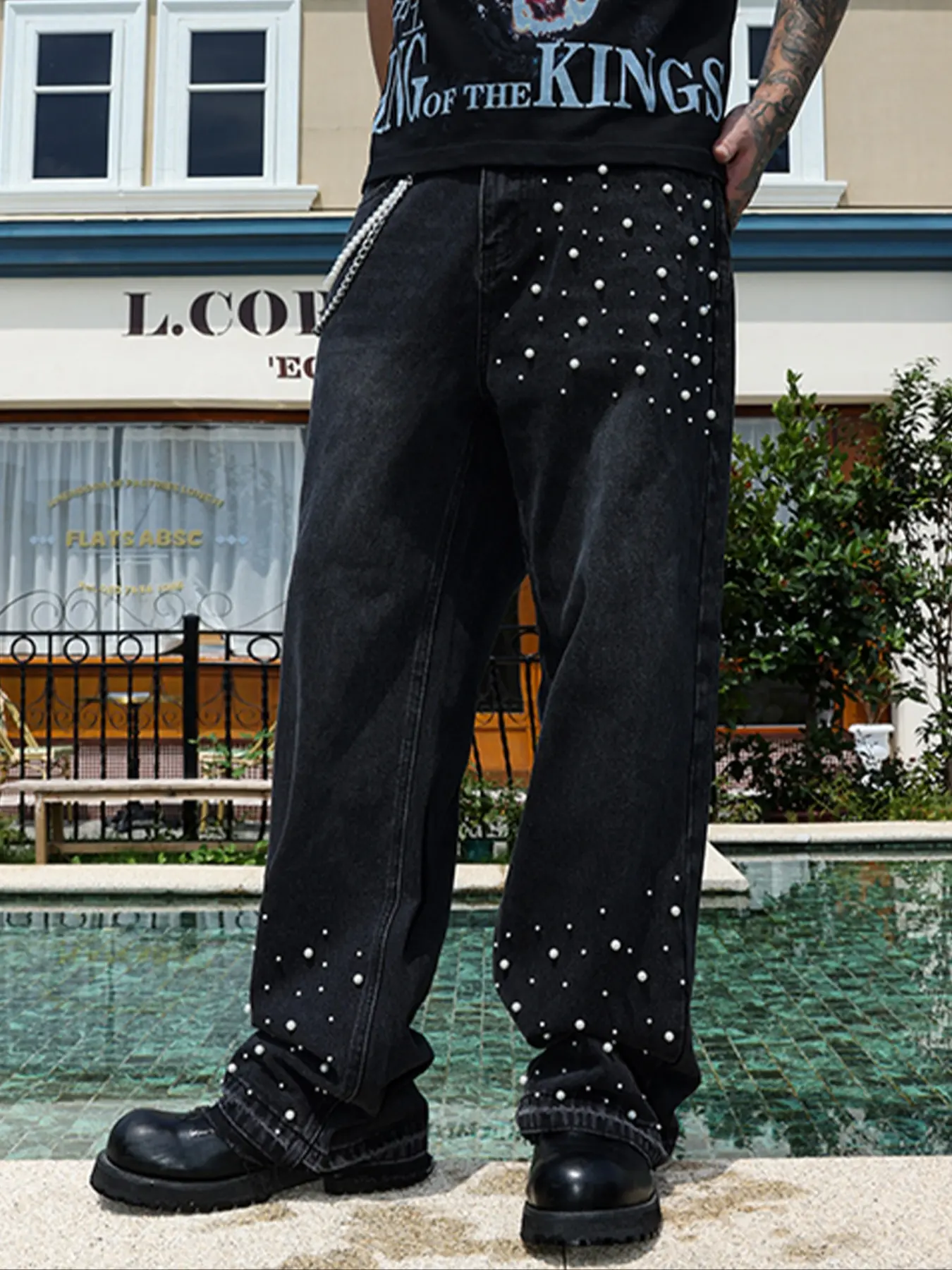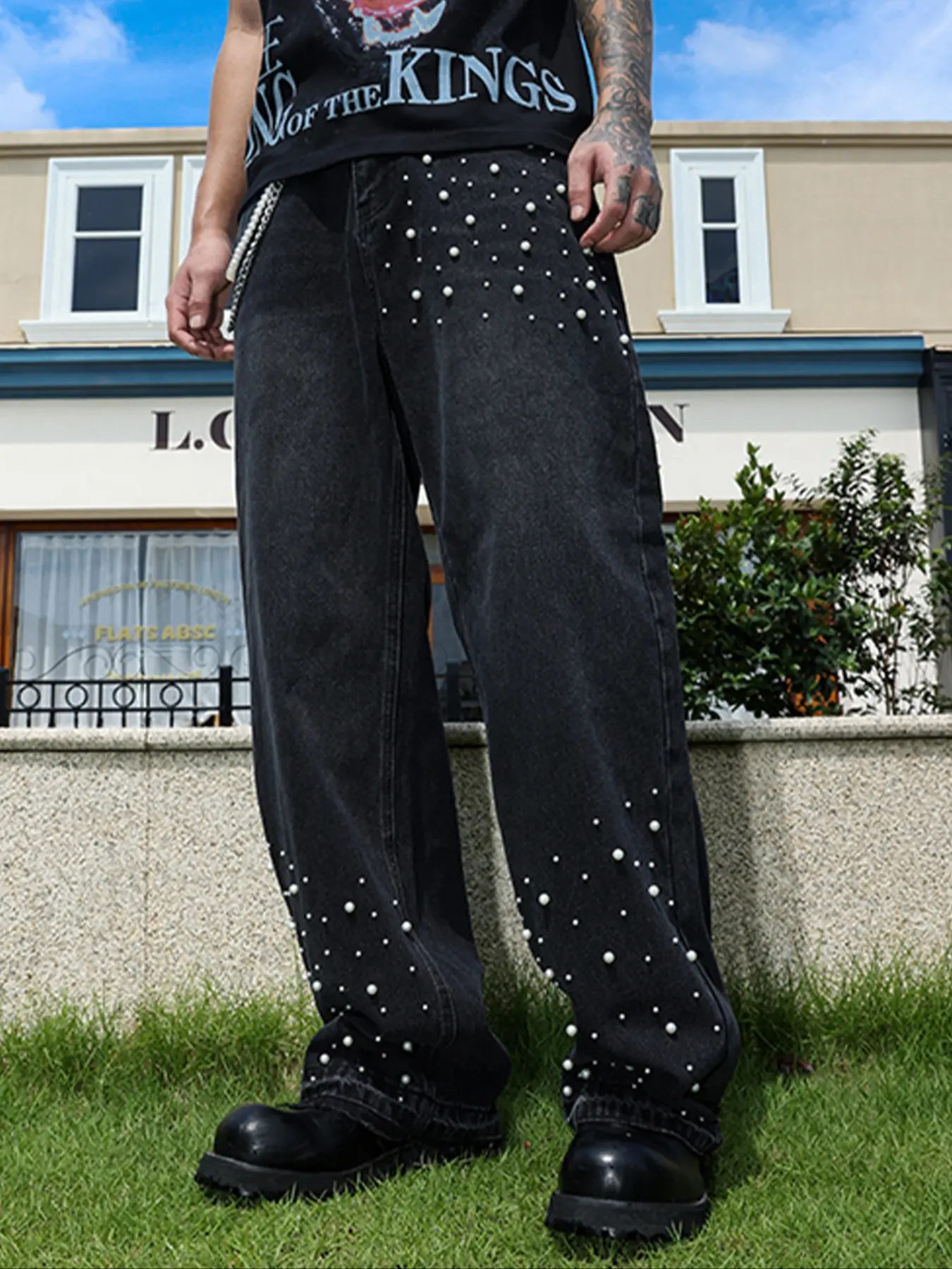 Those hand-stiched white pearls along the leg are the soul.#y2k #jeans #menstyle #ootdmen #streetwear