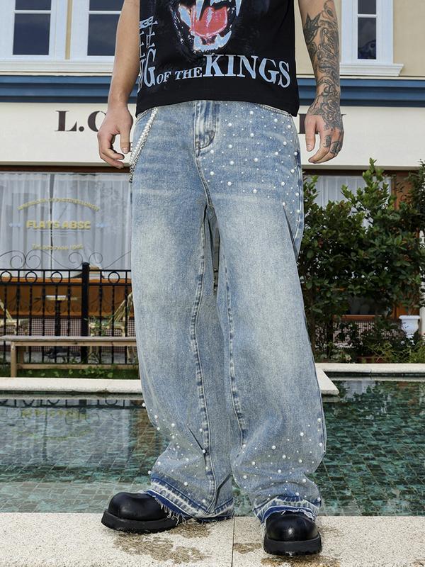 Four-Season Washed Light Blue Handmade Beaded Loose Straight Leg Jeans, Y2K Casual Streetwear, Perfect Gift for Husband or Boyfriend
