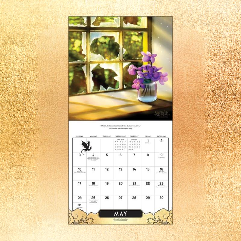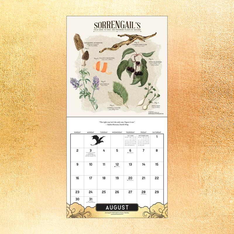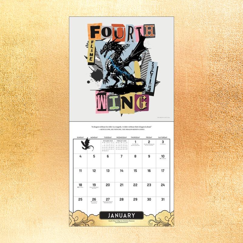 The Fourth Wing Officially Licensed Fan Art 2026 Wall Calendar showcases dynamic artwork depicting the epic fantasy world of the Empyrean book series––where dragon riders Violet Sorrengail and Xaden Riorson make their own rules of passion, war, and power.