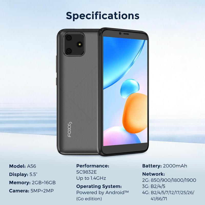 Ever wish for a phone that just handles your everyday needs without fuss? The FOXXD Unlock A56 fits perfectly in your pocket and your lifestyle. Its 5.5-inch HD screen makes watching videos and scrolling through social media a joy with crisp, vibrant visuals. Powered by 2GB RAM and 16GB of storage, it smoothly manages your texts, apps, and photos, plus you can easily add more space with a memory card. Snap quick selfies or capture memories with the 2MP front and 5MP rear cameras, perfect for sharing your day. The reliable 2000mAh battery keeps you going from morning coffee to evening chats, while Android 13 ensures a smooth, intuitive experience. Out of the box, you get the phone, a removable battery, a pre-applied screen protector, a fast-charging cable, and a wall charger—everything you need to get started right away. Ready for a simple, reliable smartphone that keeps up with you? Grab the FOXXD A56 and stay connected with ease.