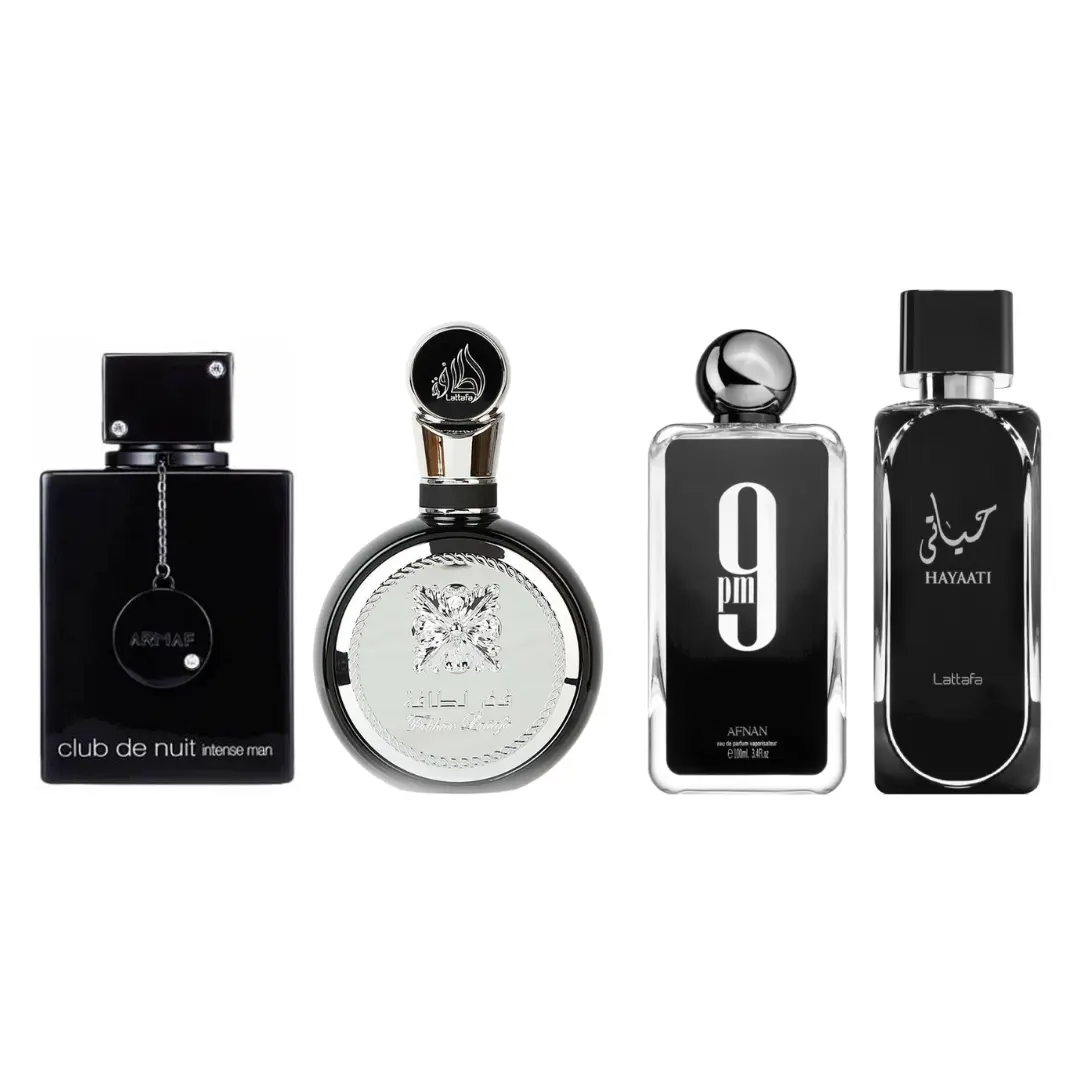 ·Bundle includes:Hayaati (Men) Perfume by Lattafa (100ml)Fakhar Lattafa Perfume (100ml)Club de Nuit Intense (Men) by Armaf (100ml)9PM by Afnan Perfumes (100ml)