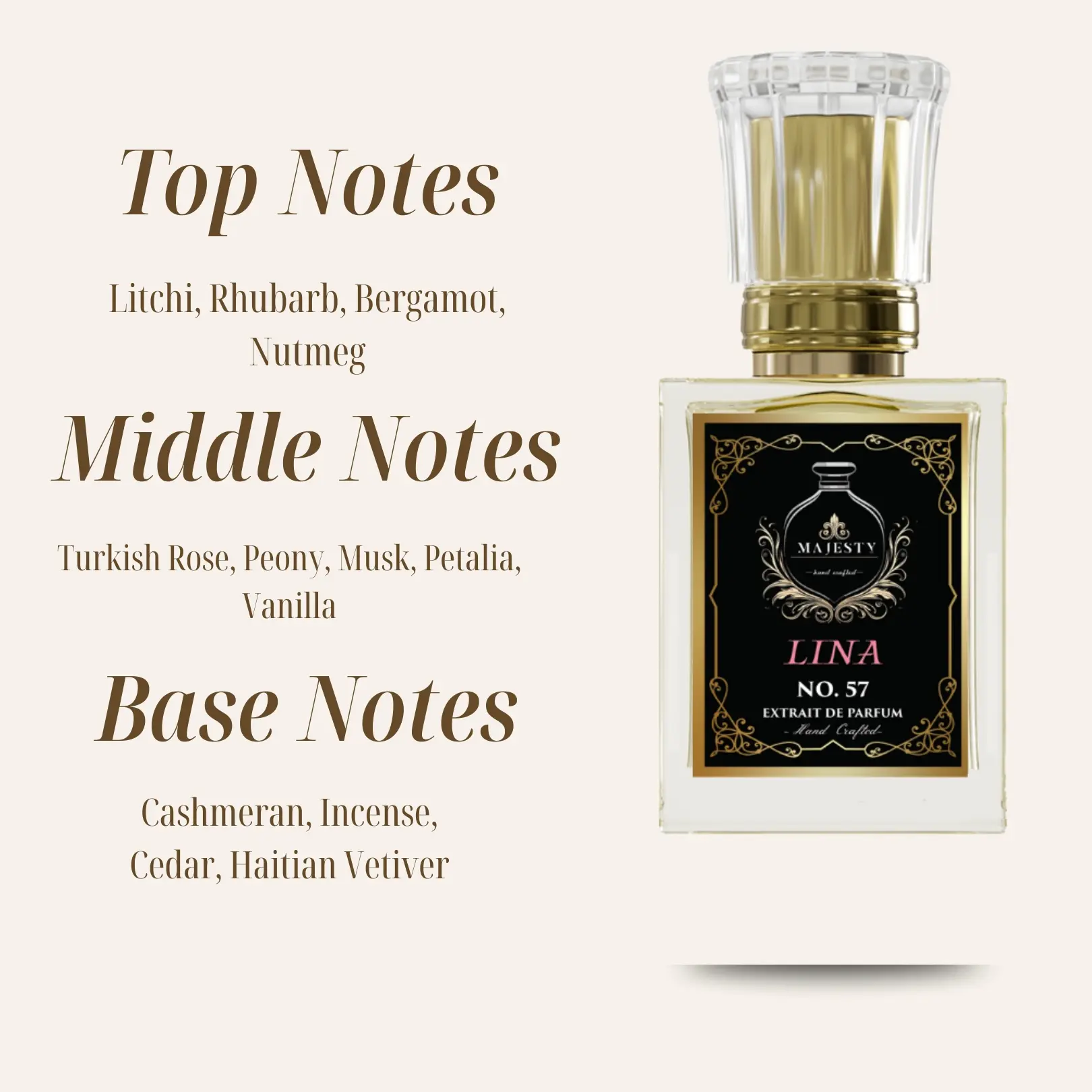 The fragrance settles into a warm, sensual base of cedarwood, musk, and subtle vanilla, leaving a lingering, irresistible trail. Feminine, soft, and refined, the dry-down makes LINA a scent that stays with you—and with everyone around you.