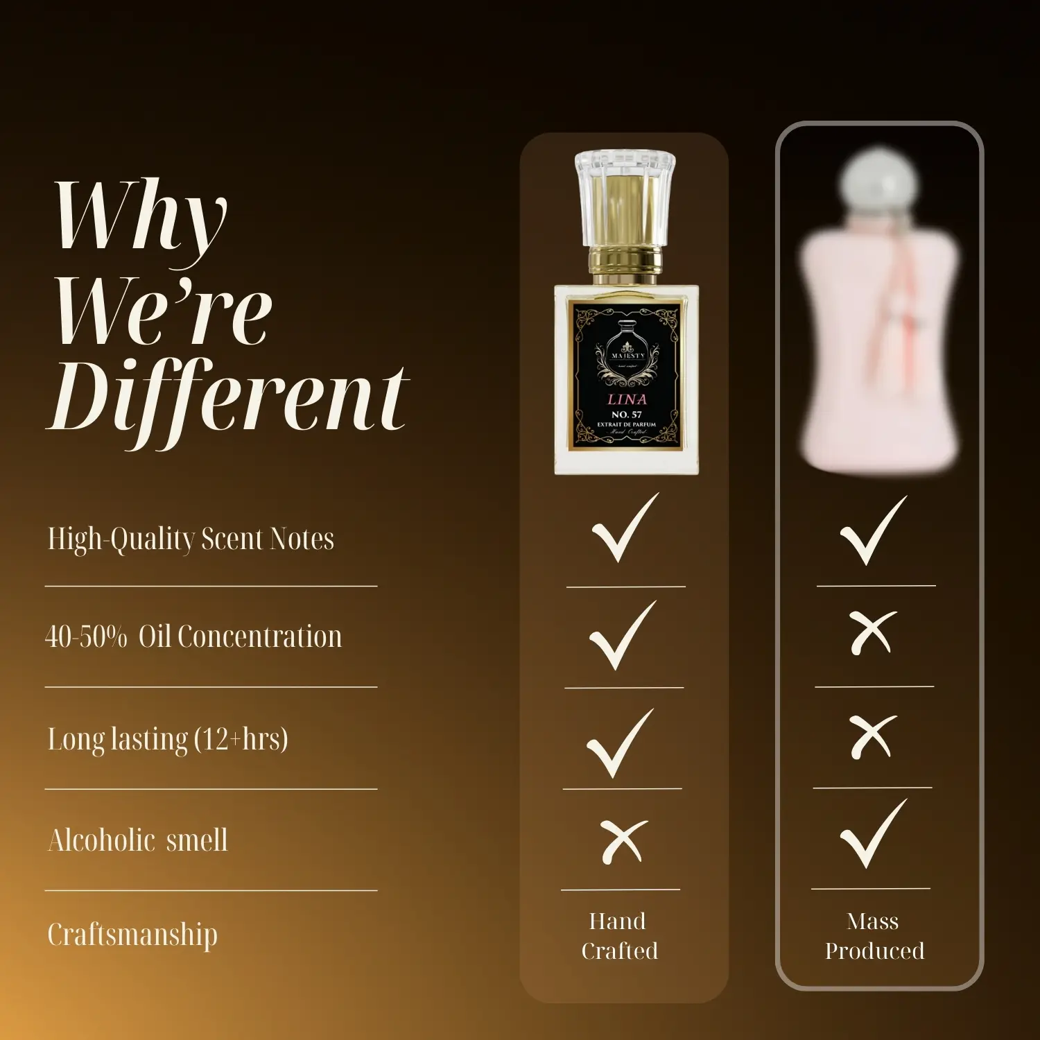 Crafted with 40–50% premium Swiss Arabian oils and blended using a traditional Lebanese recipe, LINA delivers 8–10+ hours of wear with smooth projection and exquisite longevity.