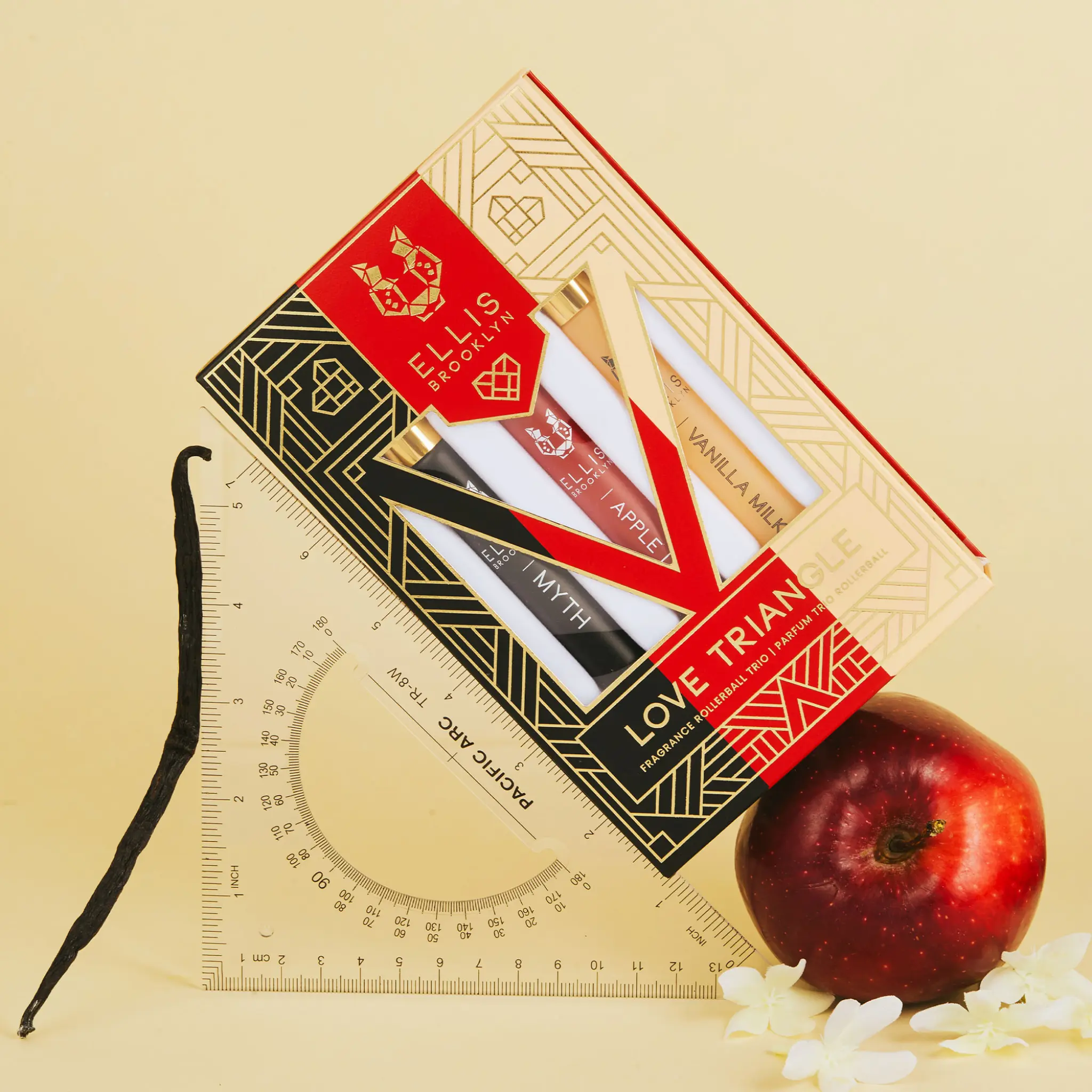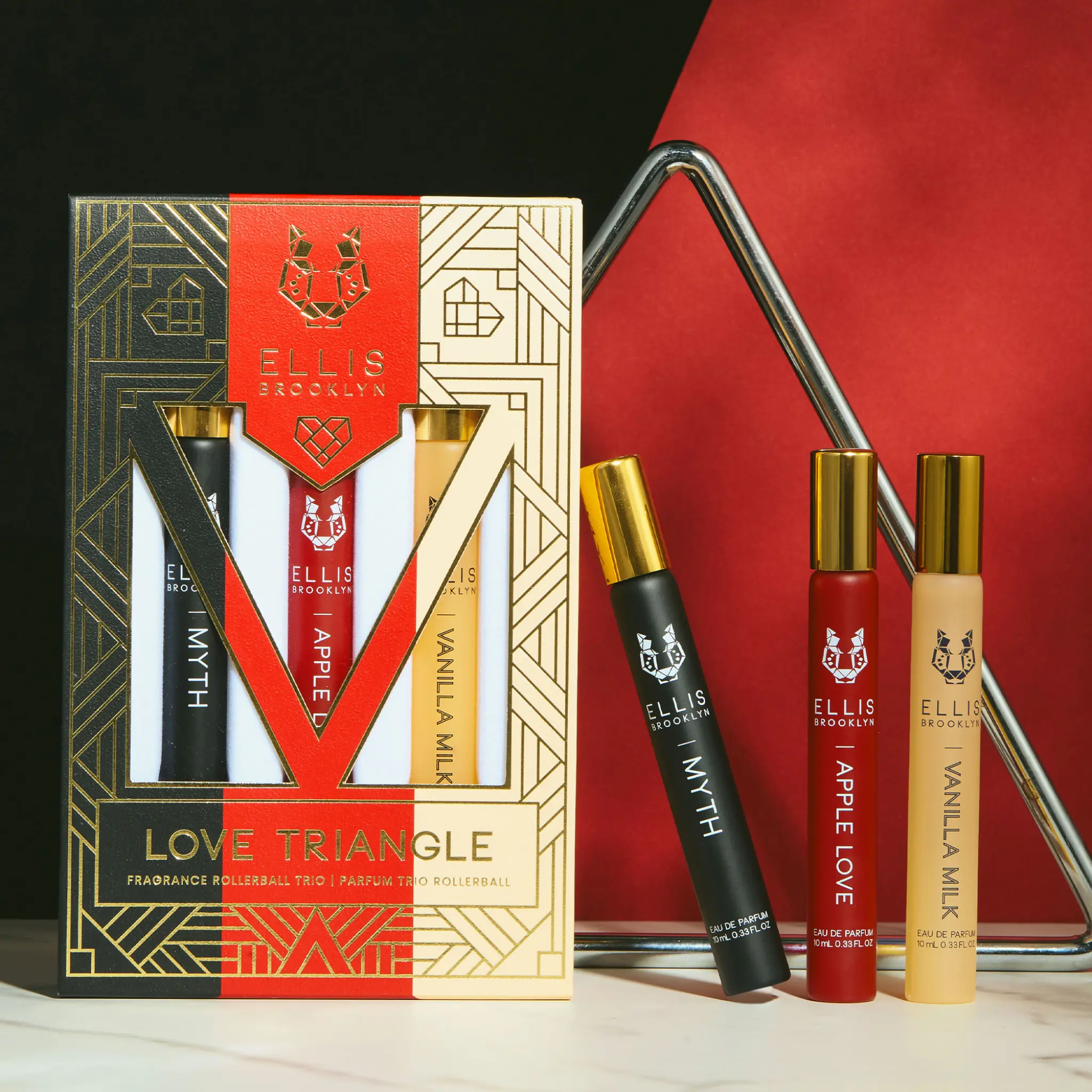 Embrace the tension, the romance, the drama of a LOVE TRIANGLE in one seductive perfume fragrance set. This LOVE TRIANGLE gift set contrasts the delicious addictiveness of APPLE LOVE and VANILLA MILK Eau de Parfums with the clean sheet-bare skin vibe of MYTH Eau de Parfum.