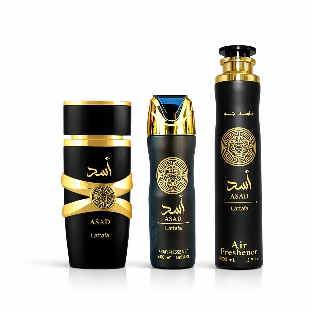 Discover the perfect blend of fragrance and functionality with the Lattafa Asad EDP 3.4FL.OZ, Deodorant 200ML, and Airfreshner 300ML Fragrance Set. This set is designed to enhance your daily routine with a refreshing scent.