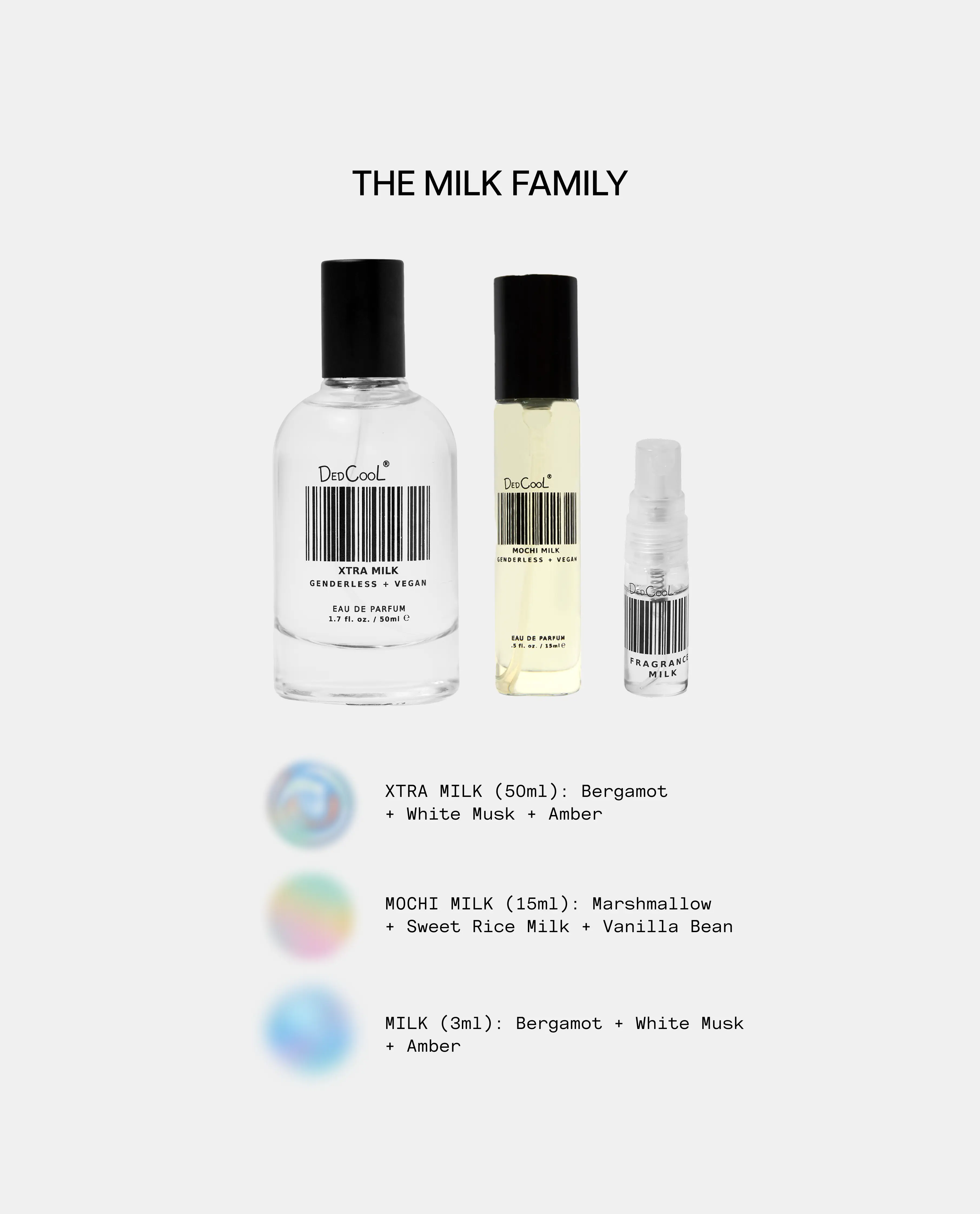one scent family, three ways to be you. try the Milk Family Multi Size Fragrance Set now on dedcool.com #fragrancetiktok #perfume #fragrance