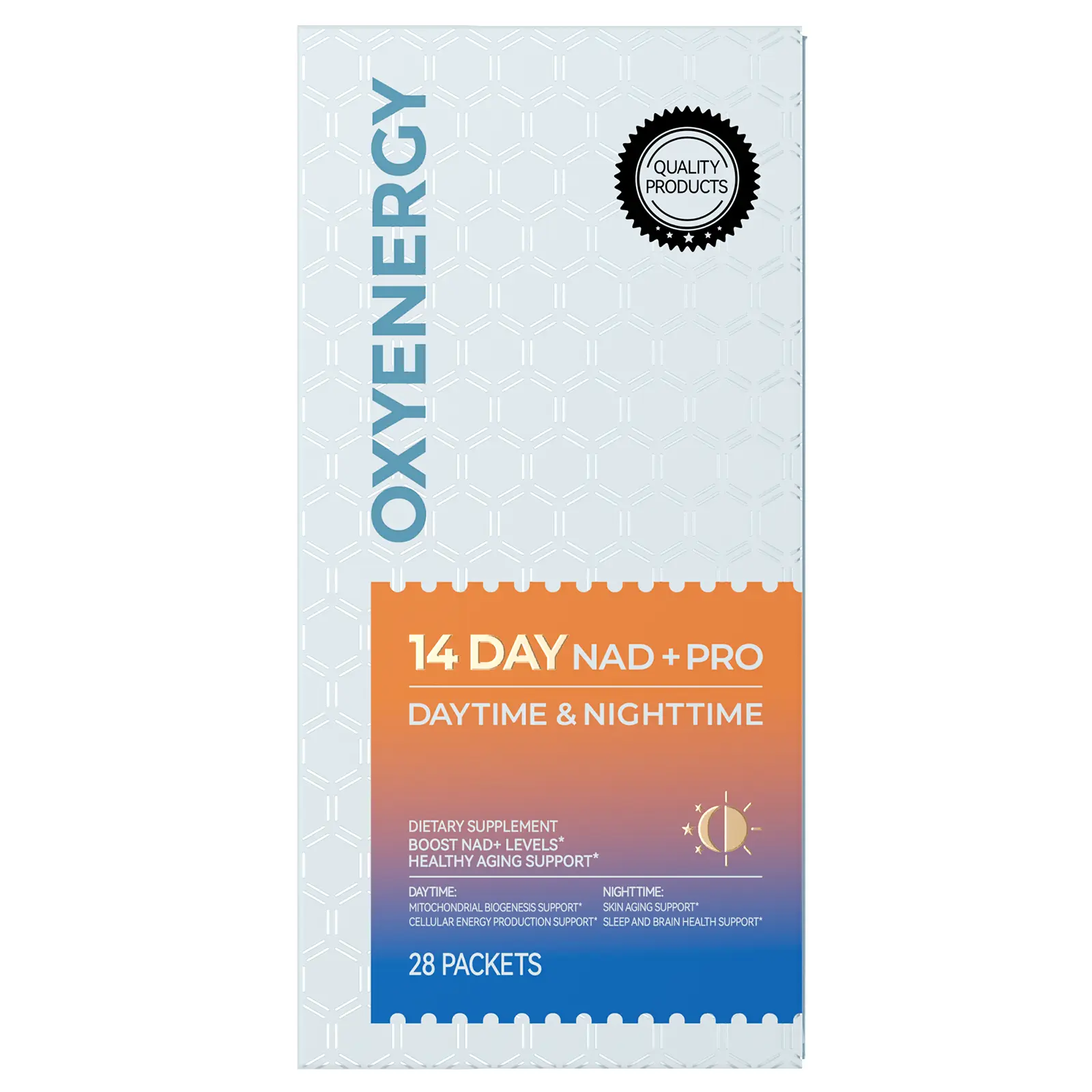 Tired by noon, wired by night? It’s not you — it’s your NAD⁺. This essential cellular coenzyme fuels energy, repair, and vitality — but declines sharply with age. Our 14-Day NAD+ PRO Day & Night System delivers round-the-clock rejuvenation in a delicious, fast-absorbing powder format.