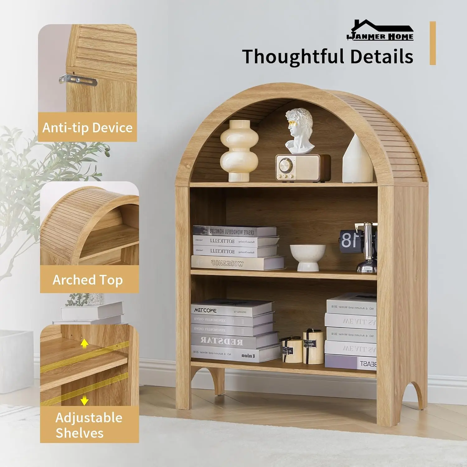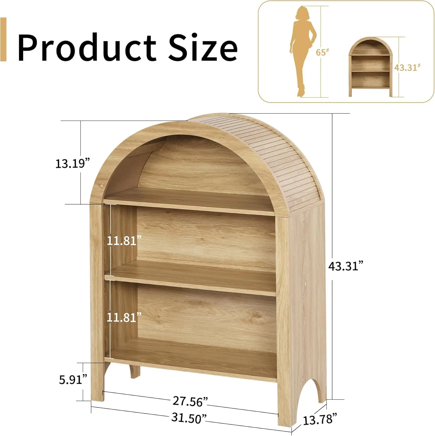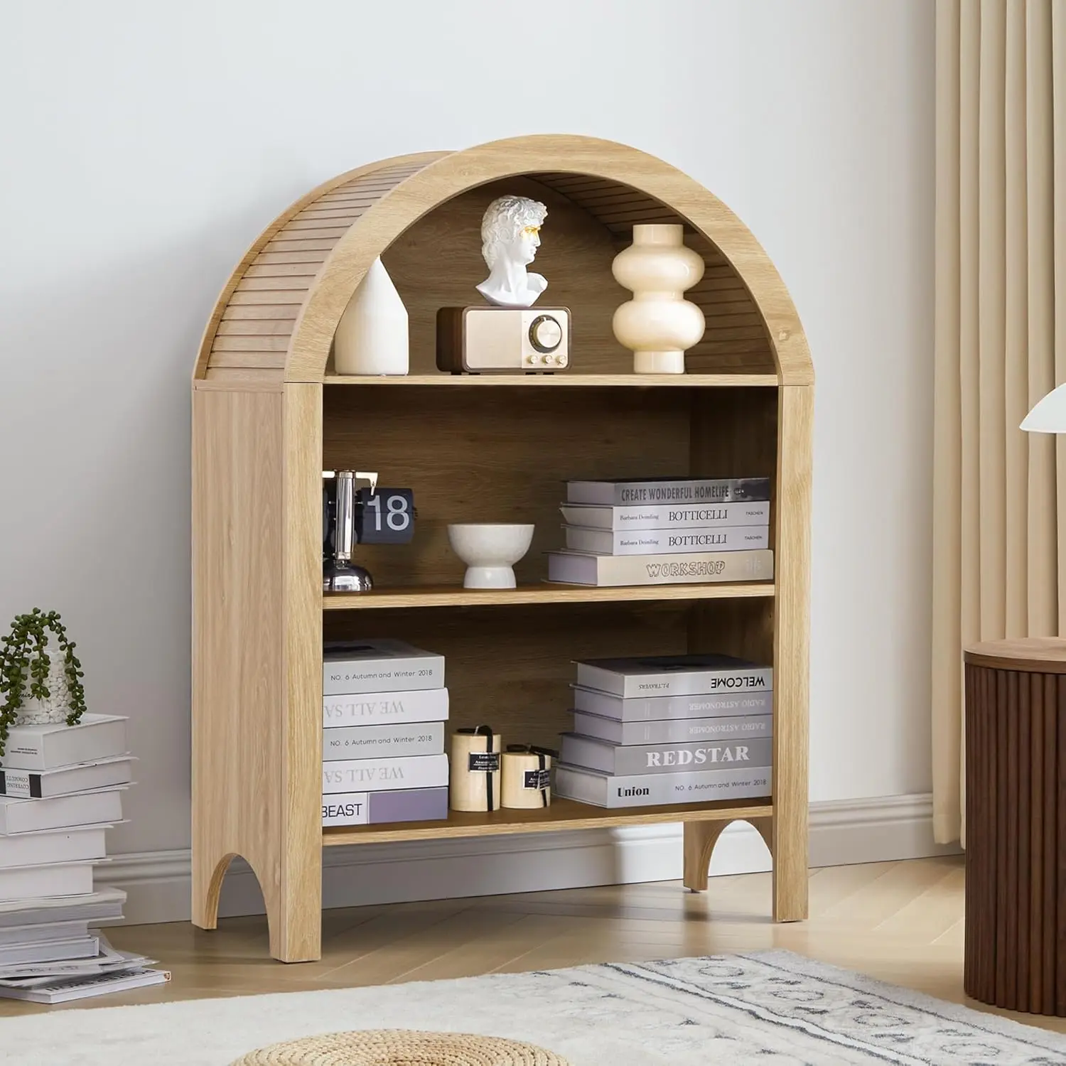 ·【Stylish Arched Design】This 43.3" tall arched bookshelf features an elegant arched cabinet design that will enhance your home decor. The arched and rounded top with linen and groove decorations adds a touch of modern farmhouse and bohemian elegance to any room