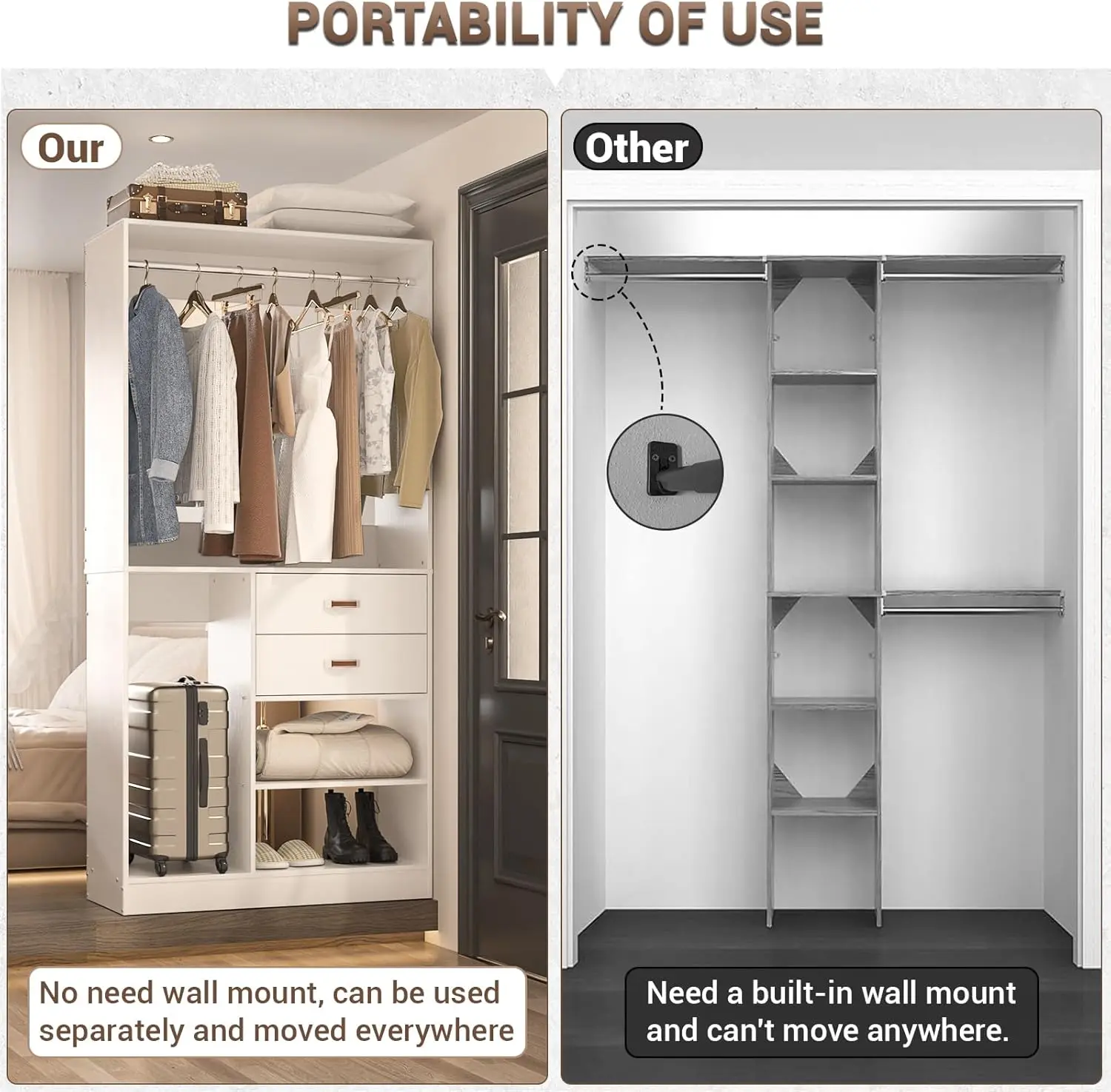 ·Freestanding Closet System for Your Bedroom - Do you feel frustrated because the closet system can be only wall mounted and can't be a stand-alone wardrobe that can move around? Armocity freestanding straight cabinet wardrobe meets your needs. The stand-alone design makes it easy to move around, you can move it to a different bedroom if you decide to re-furnish your room. You can take it with you if you decide to move home too.