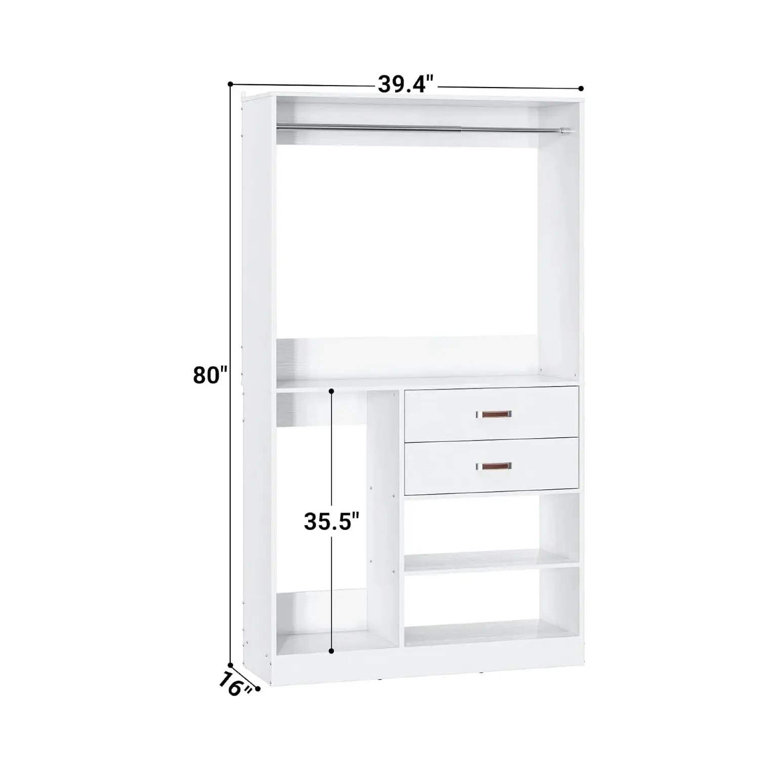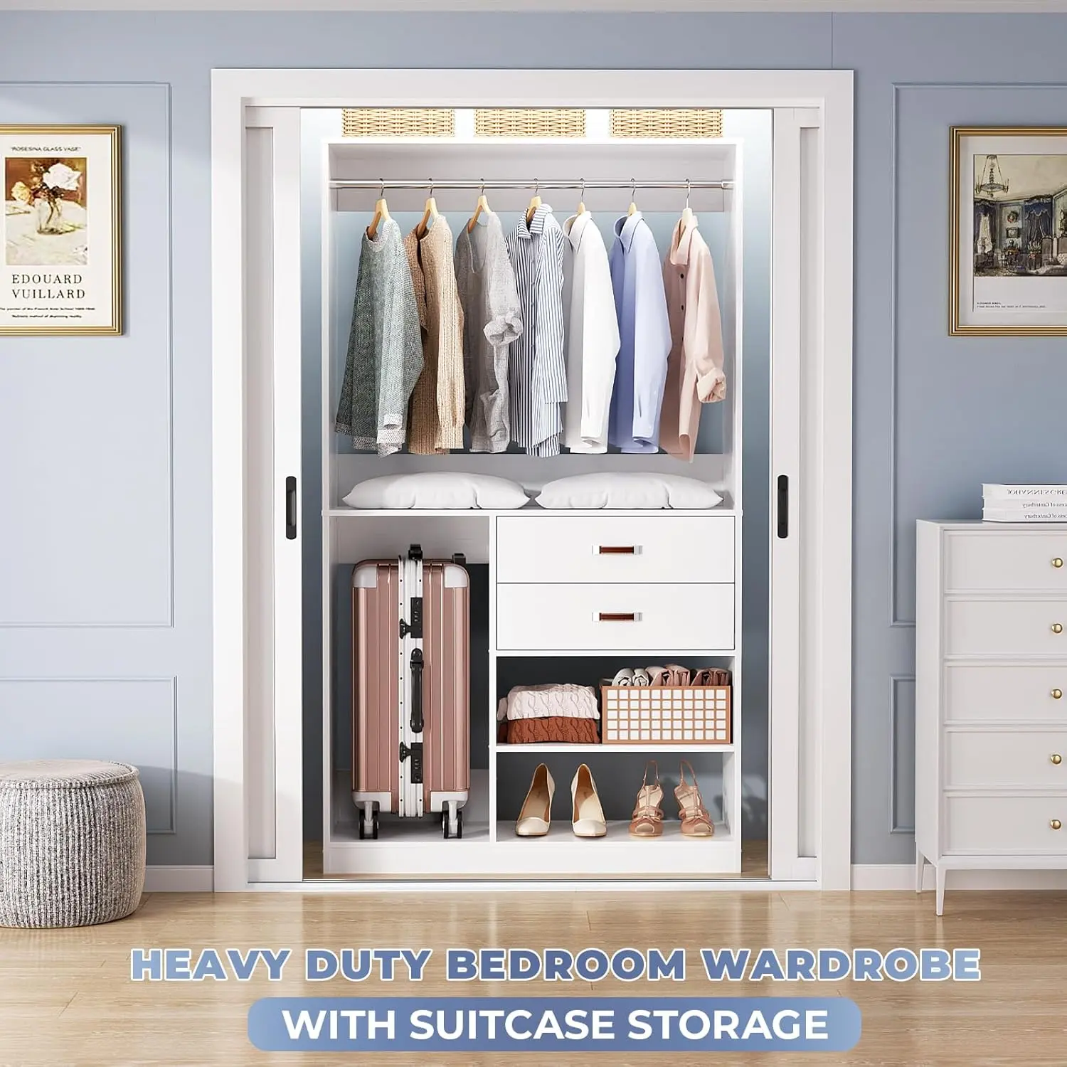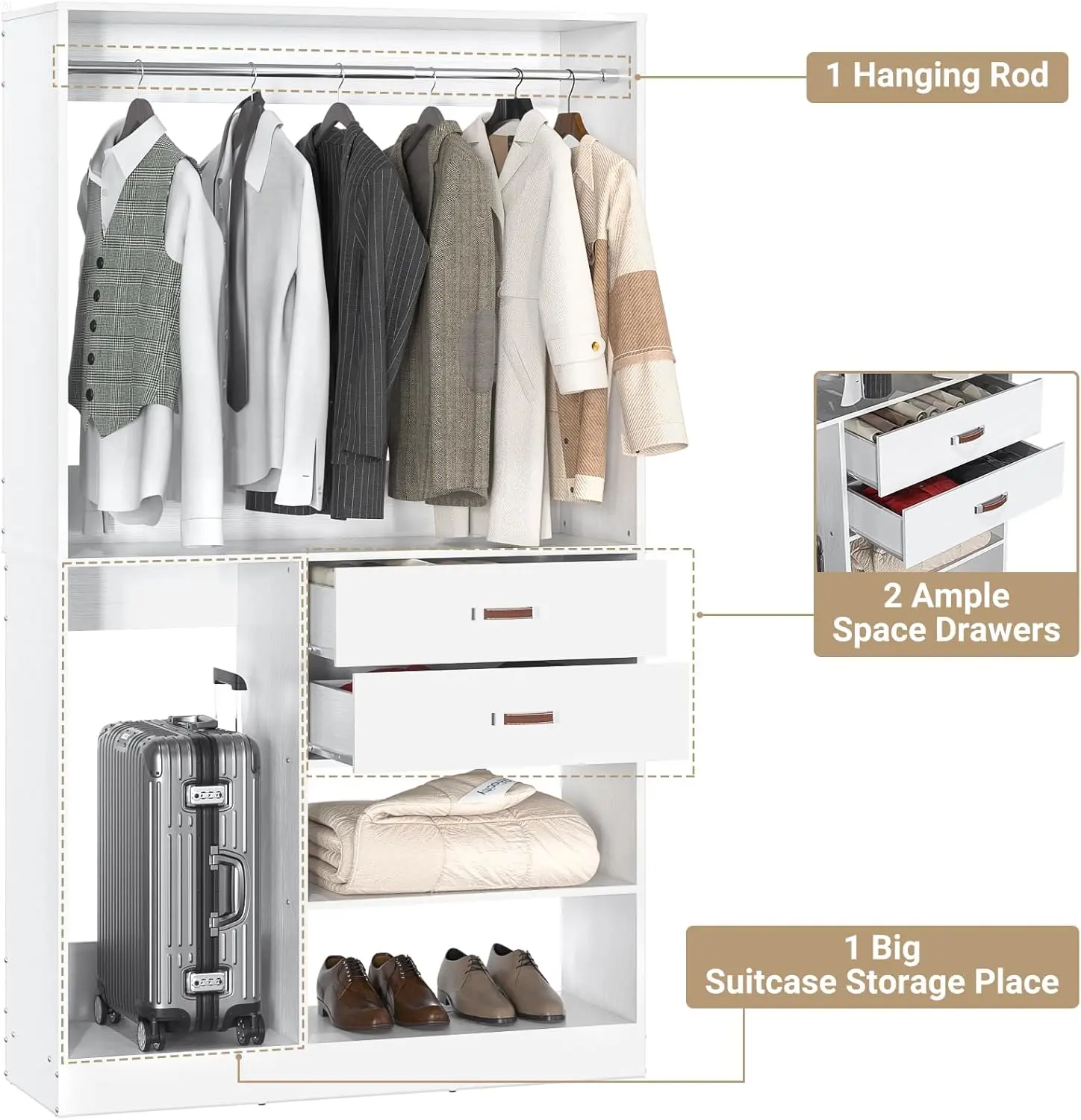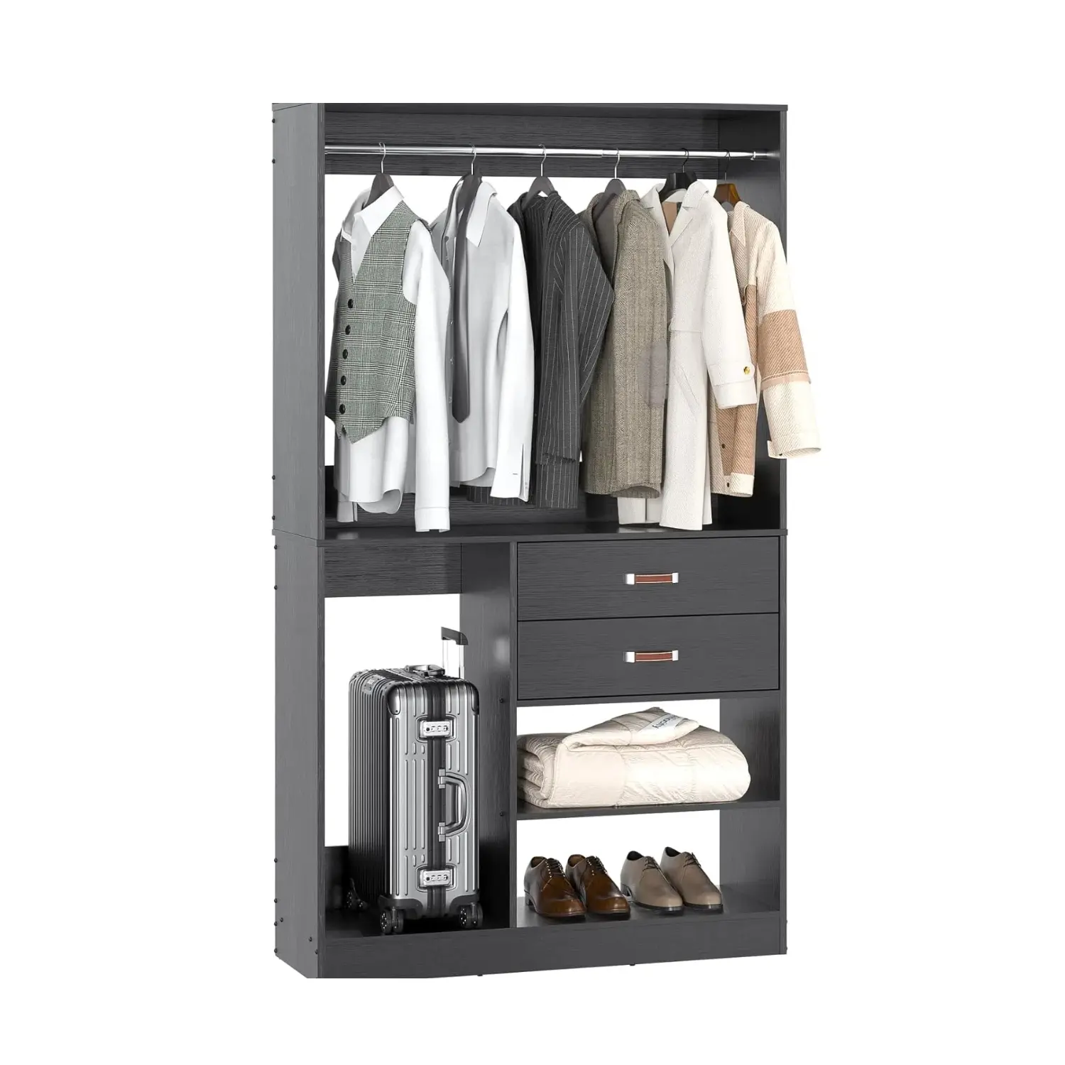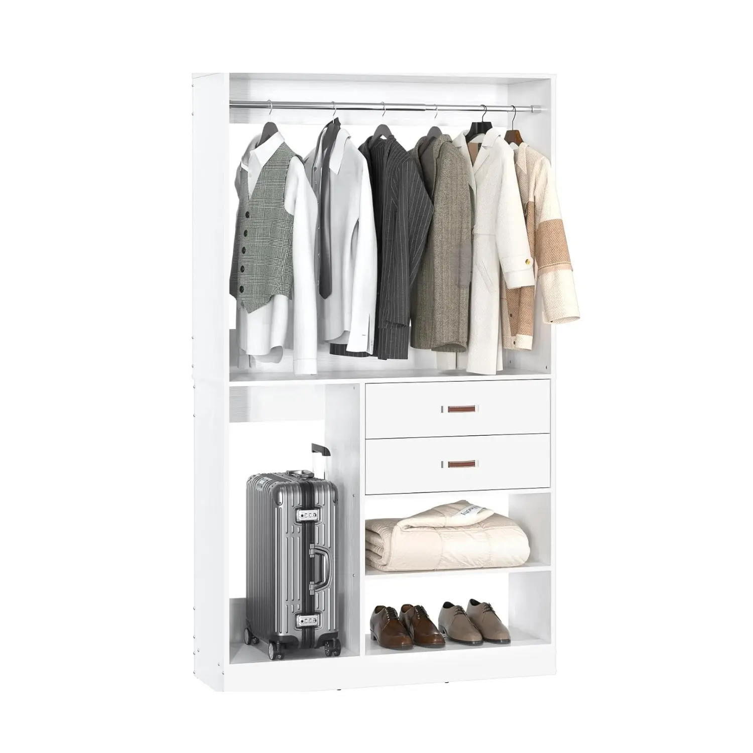 ·Closet Organizer System with Suitcase Storage and 5 Storage Shelves - Are you looking for a closet that can not only store clothes but also suitcases? Armocity closet system with big suitcase storage space can meet your needs. This 40" closet system has 5 storage shelves, 1 hanging rod, and 2 wood storage drawers with 250+ pcs clothes capacity. You can hang dresses, T-shirts, jackets, put the storage boxes, shoes, baskets, folded clothes, and bedding in this freestanding closet system.