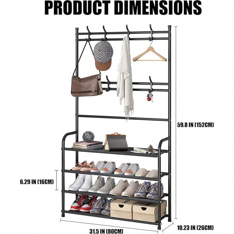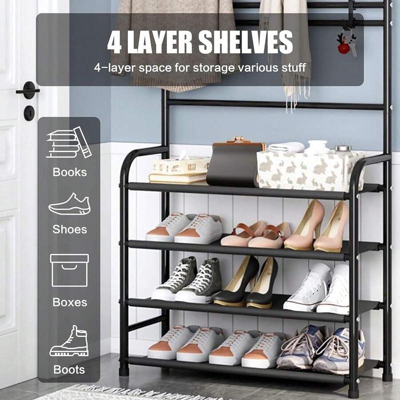 The material is sturdy, and it's easy to install. You can put shoes on the bottom and hang hats, clothes, etc., on the top. It's a practical shoe rack.