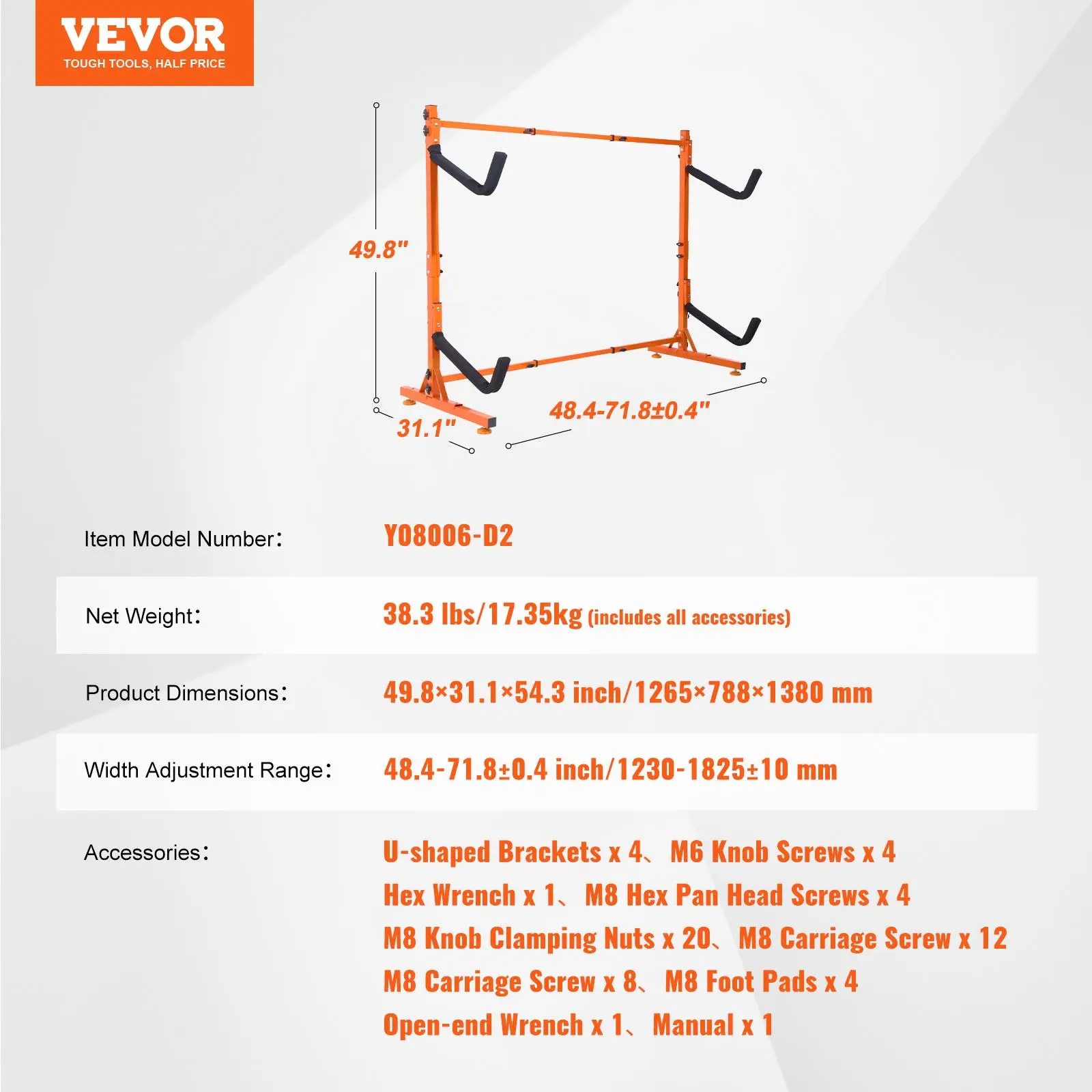 • Tool-Free Width Adjustment: Easily adjust the outdoor storage stand's width from 48.4 to 71.8 inch (1230-1825 mm) to accommodate various kayak sizes. With a 2.0-inch (50 mm) adjustment increment, you can quickly modify the width using hand screws included in the accessories. Ideal for storing long double kayaks or other large equipment.