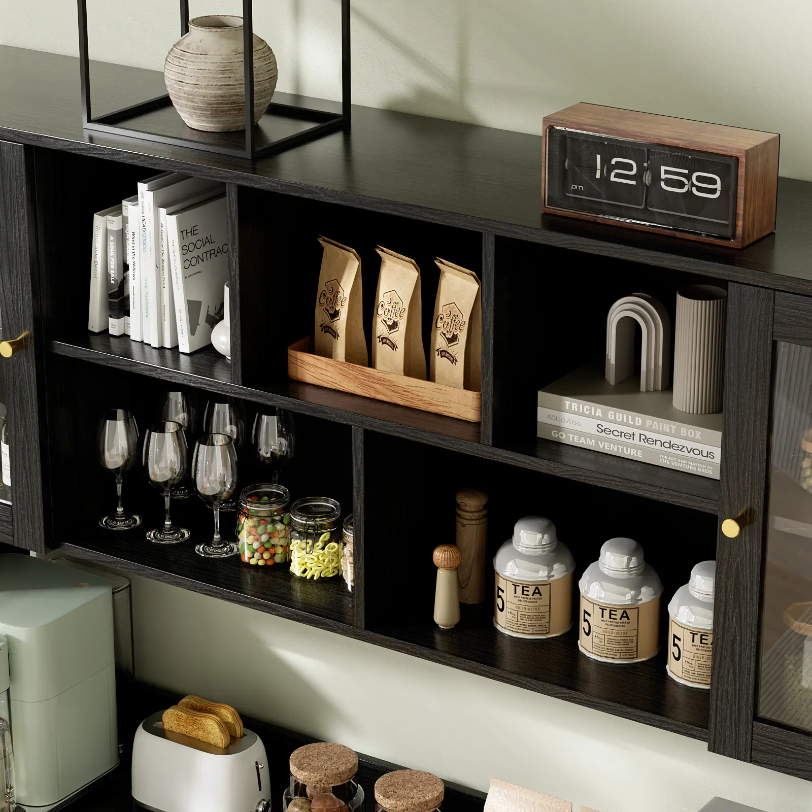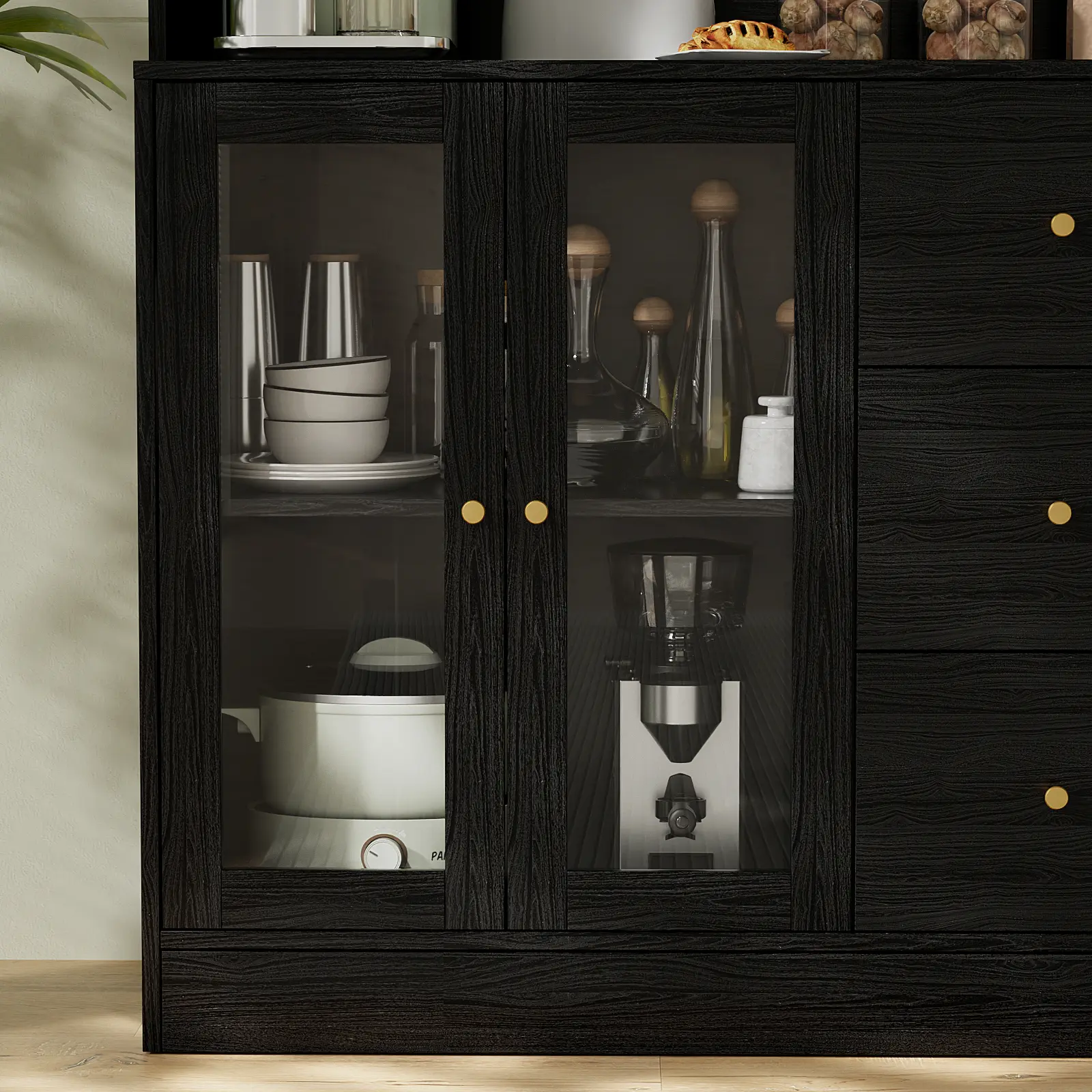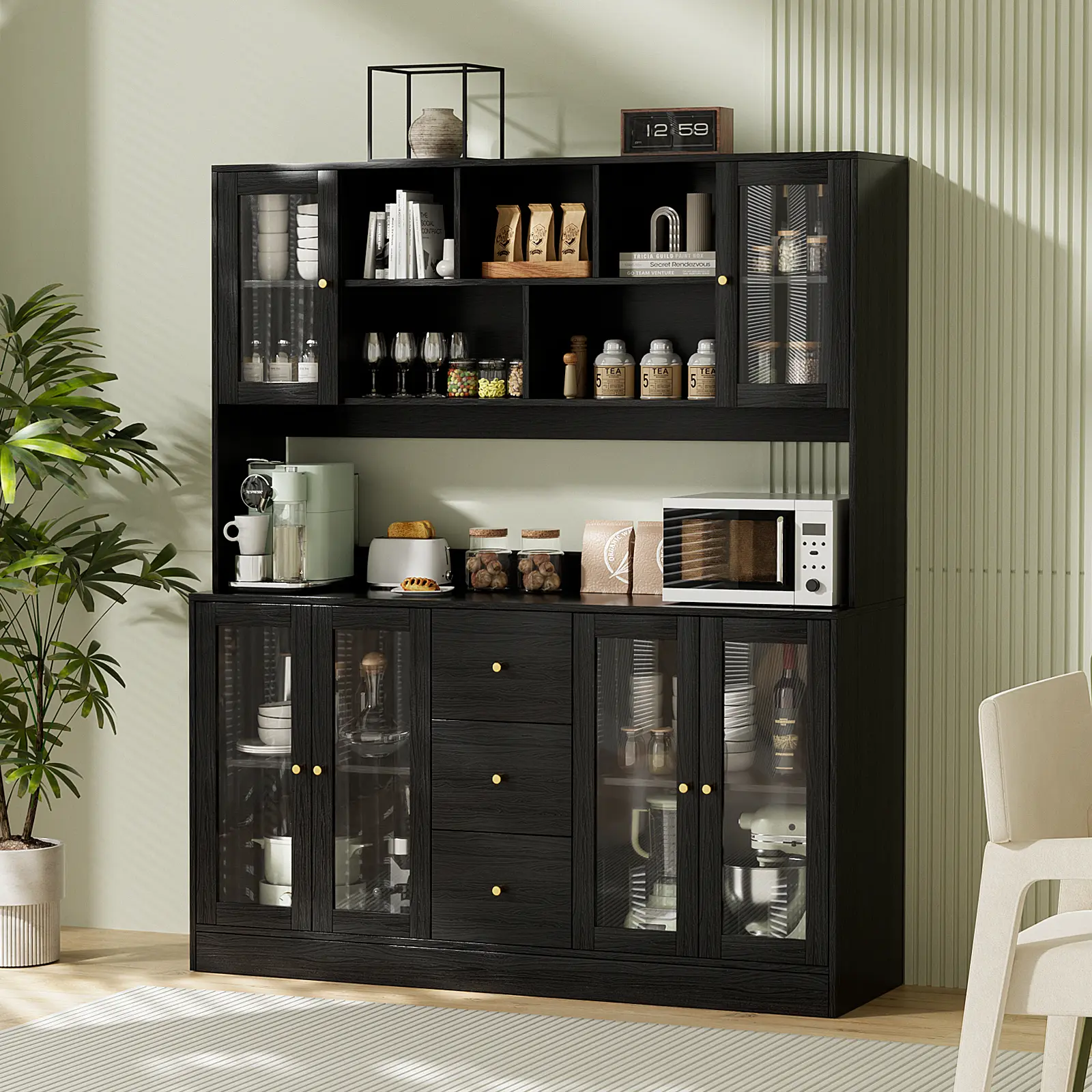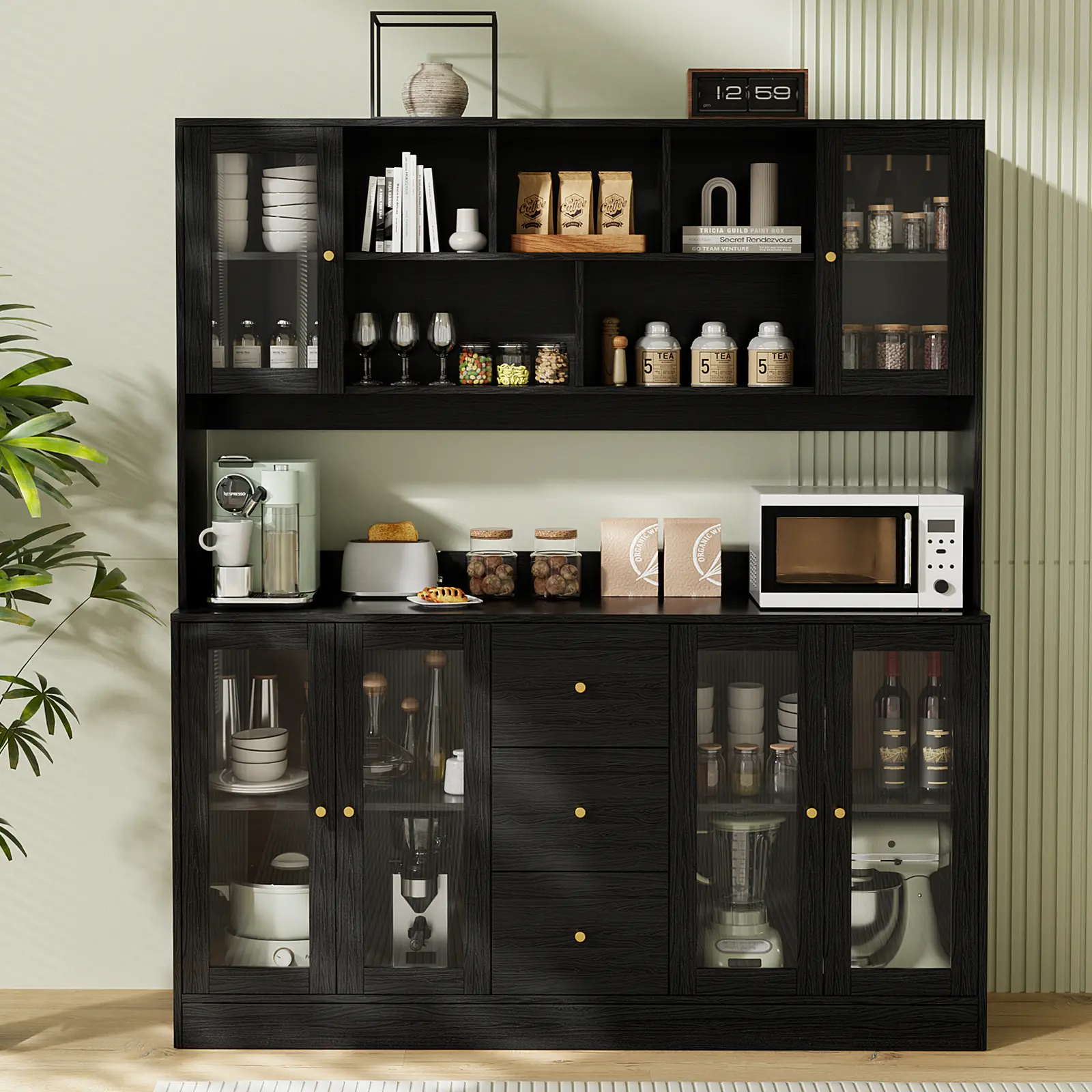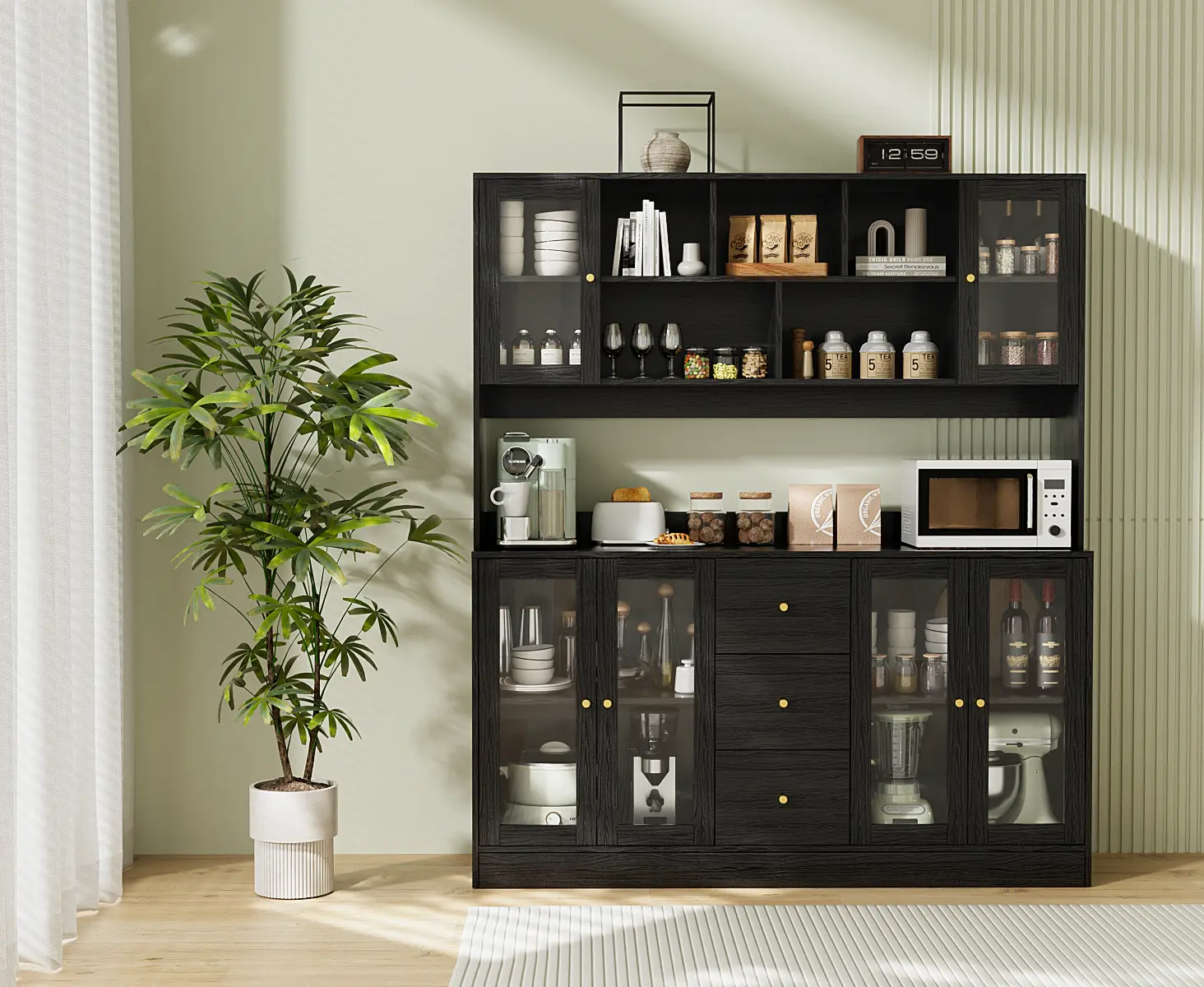 The countertop offers ample room for kitchen appliances, keeping your microwave, cookware, and essentials conveniently accessible. Six glass-front cabinets provide dust-free protection, while five open upper compartments perfectly showcase your glassware, bar essentials, or decorative items - combining practicality with elegant display.