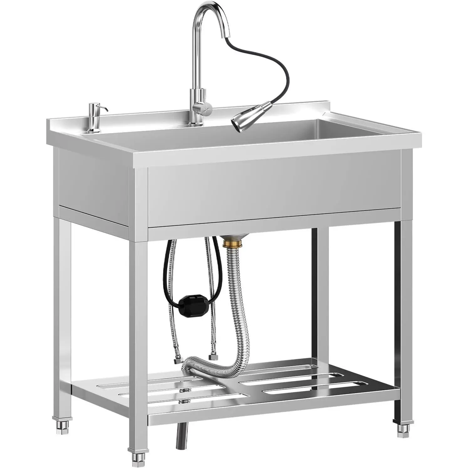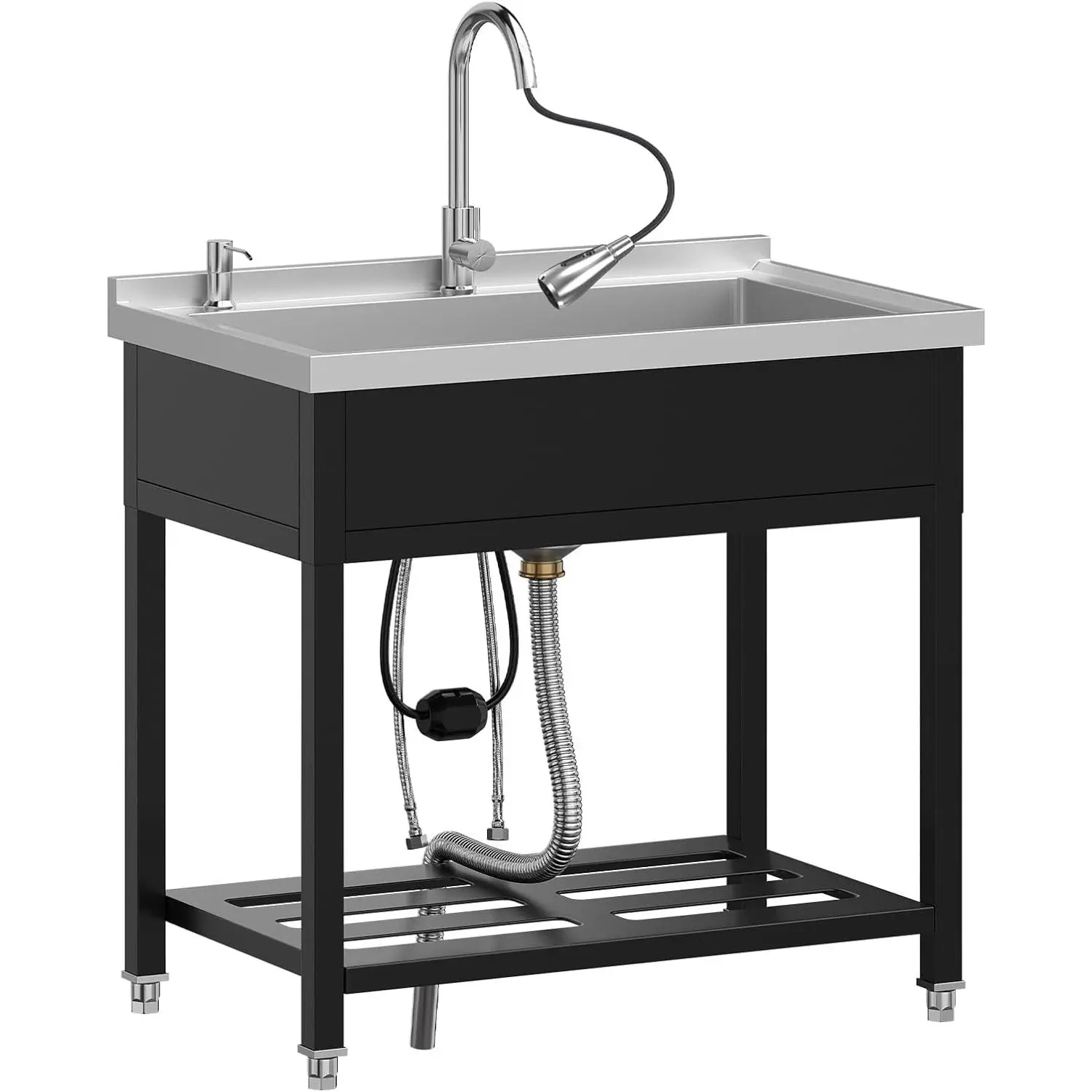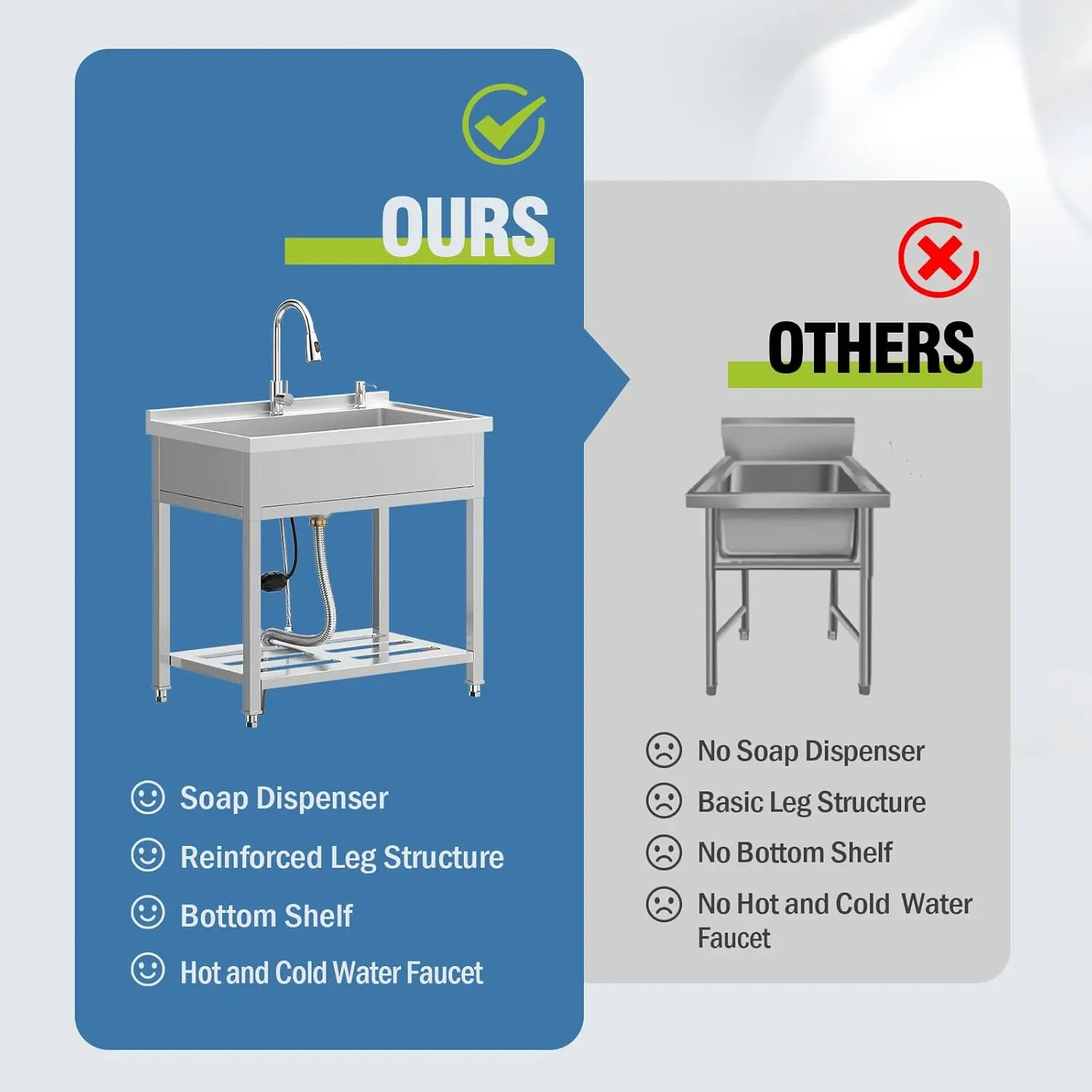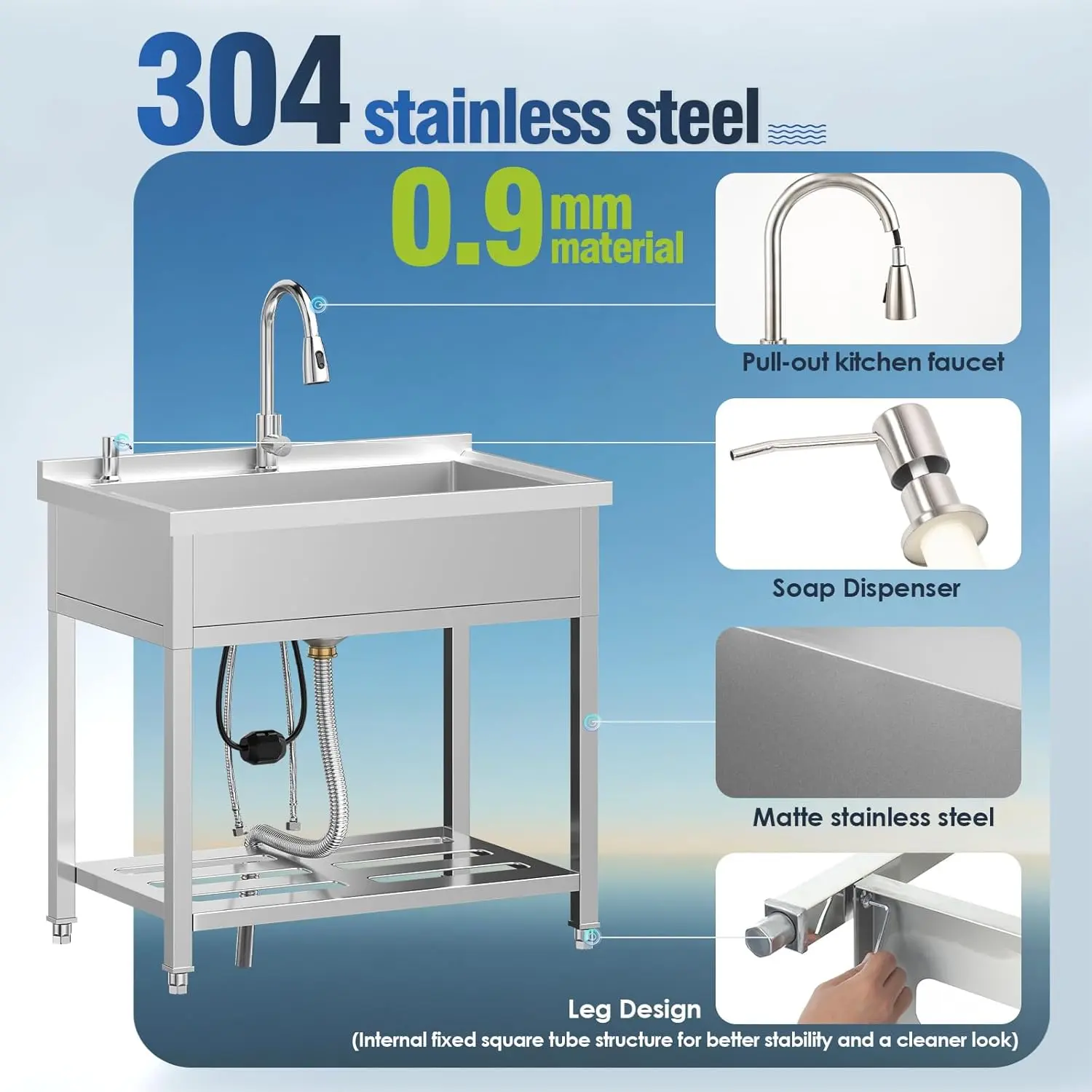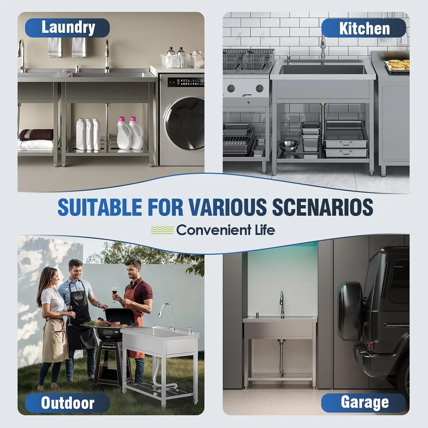 [Spacious Sink & Stable Support Frame] Measuring 35.4" * 22.4" * 33.9", this single-bowl utility sink stainless steel model offers ample space for daily cleaning tasks, from large cookware to gardening tools.The heavy-duty frame includes adjustable feet and a bottom shelf for added storage - combining functionality with stability.