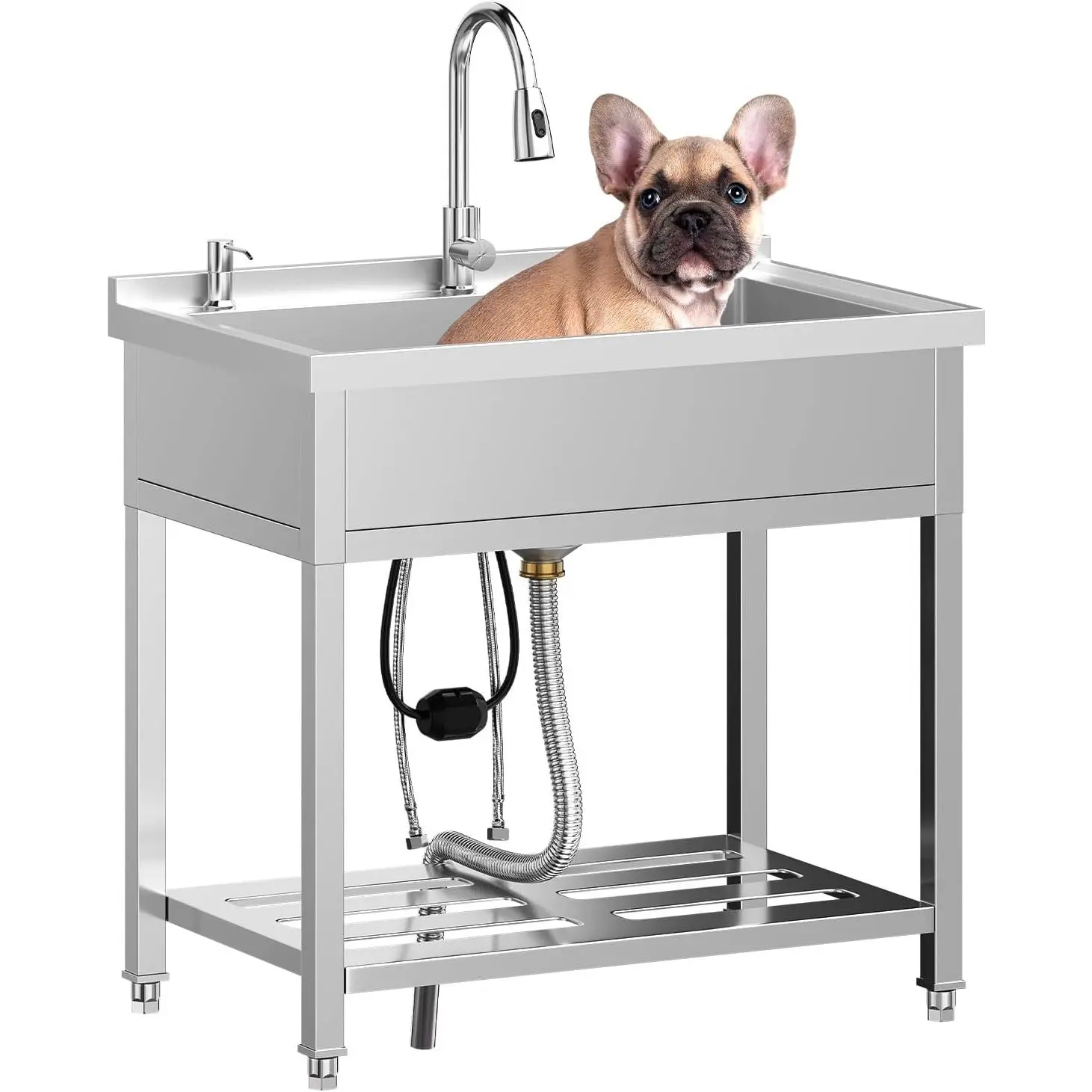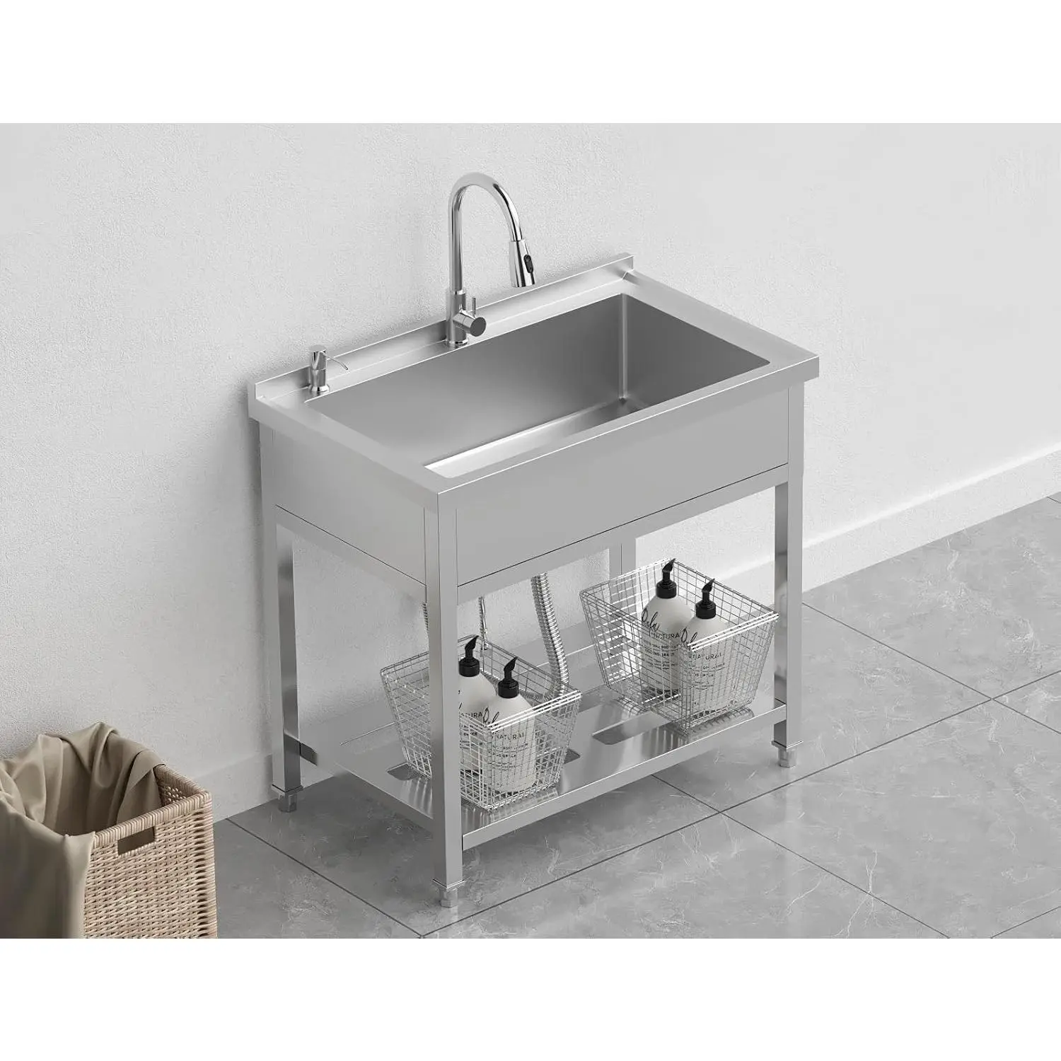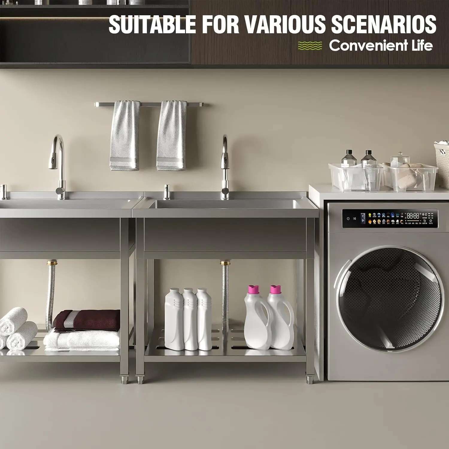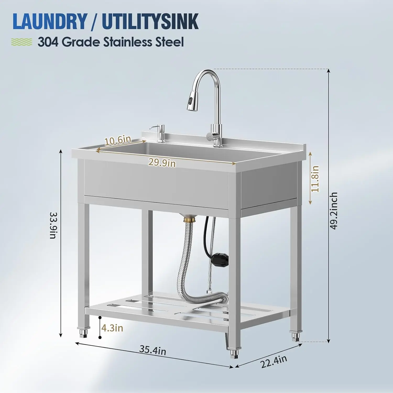[Durable Brushed Stainless Steel Build] Crafted from premium 304 stainless steel with a sleek brushed finish, this stainless steel utility sink freestanding design resists rust, scratches, and wear even in high-use areas.The reinforced construction ensures long-lasting performance both indoors and outdoors - ideal for laundry, garage, or patio use.