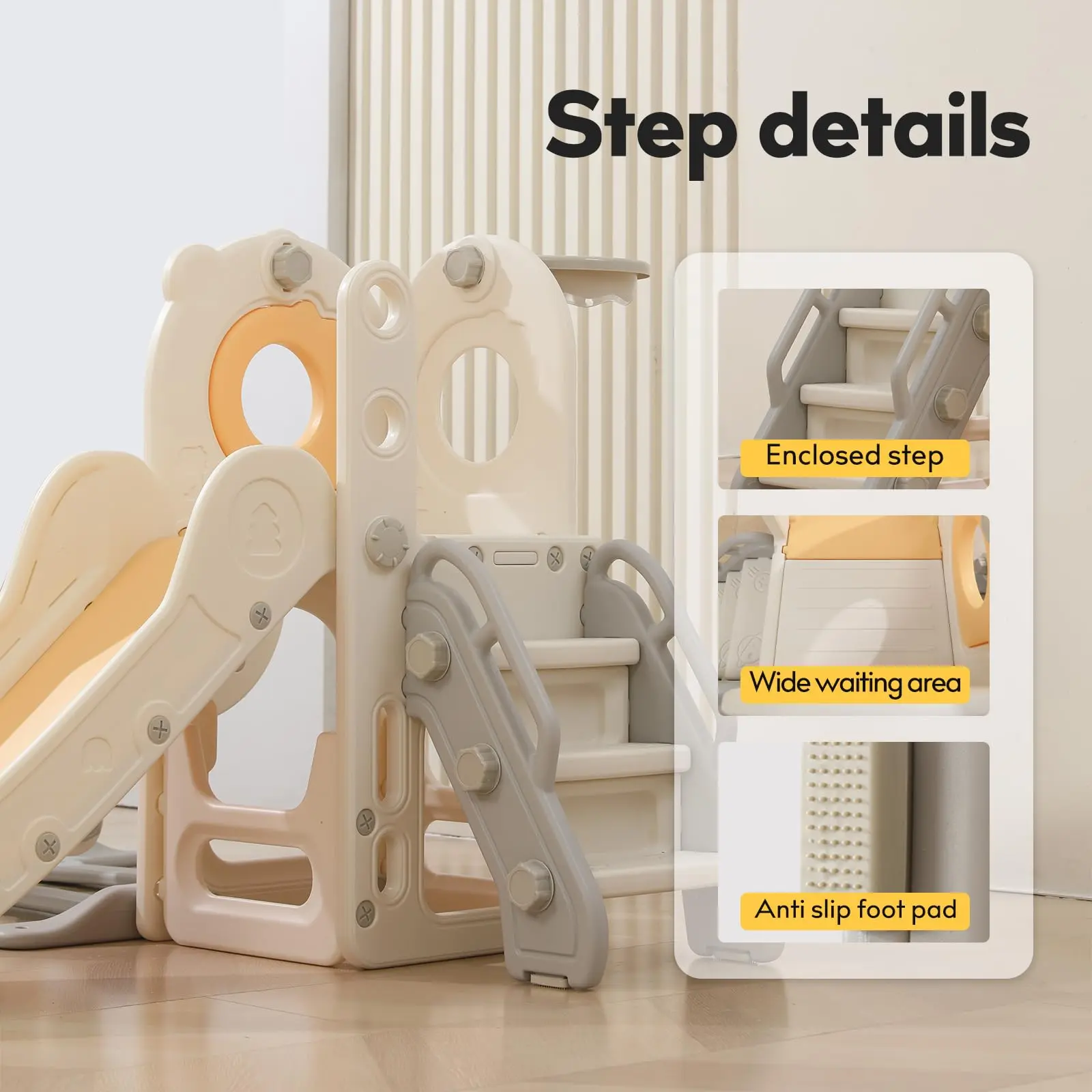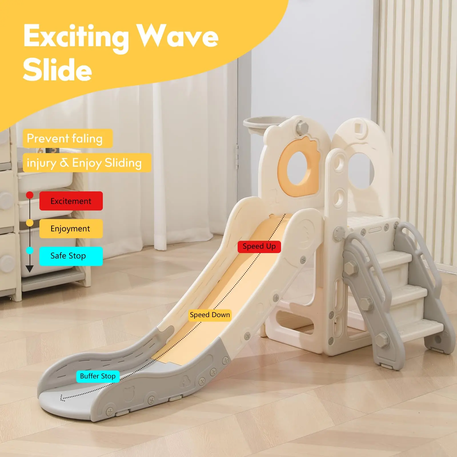 ·【5 IN 1 EDUCATIONAL TODDLER SLIDE】: Our toddler slide offers a slide, a basketball hoop, a storage basket and a 3-story staircase. The toddler play set promotes fitness, balance and fosters friendships while kids have fun. The storage design also allows for better organization of toys that are not in use.