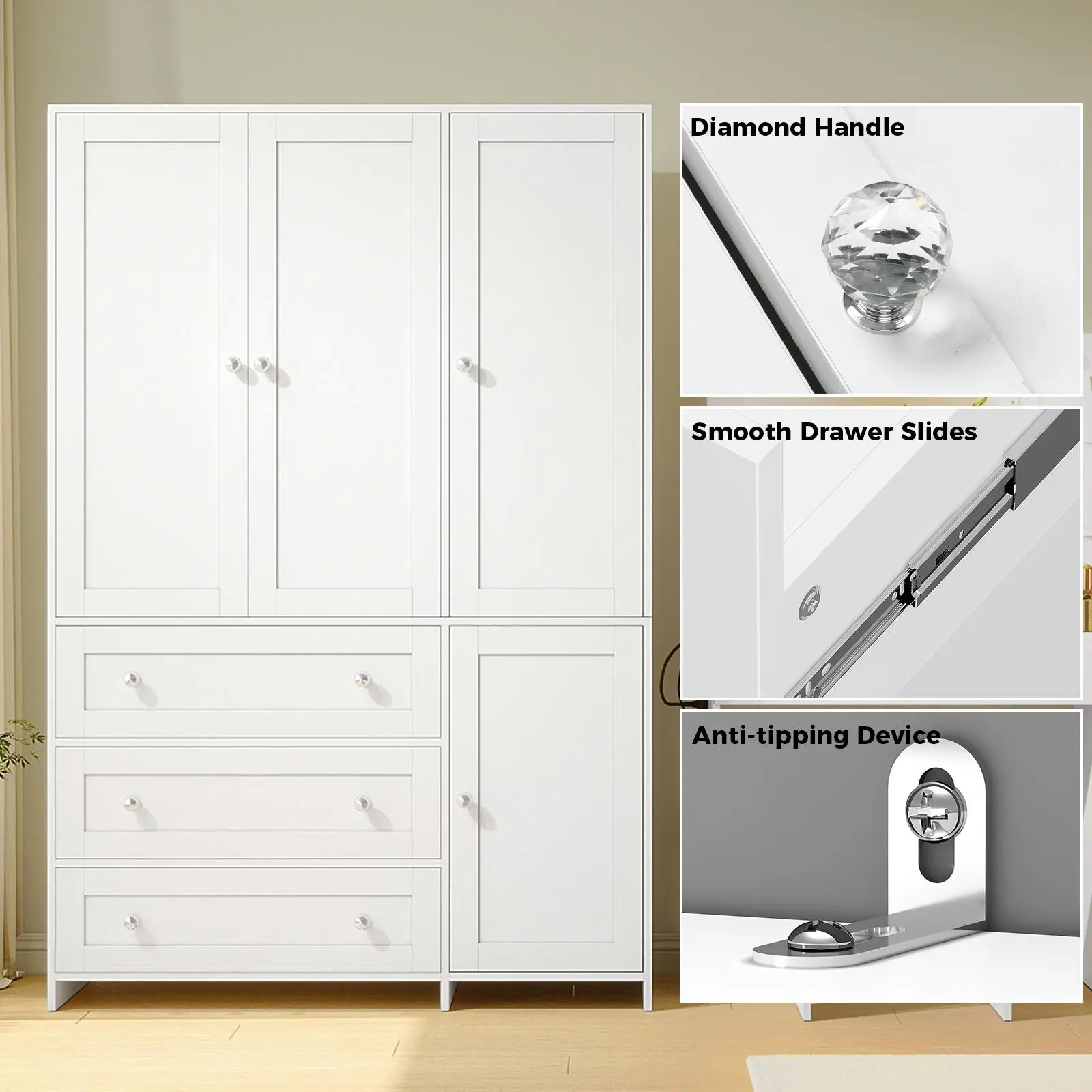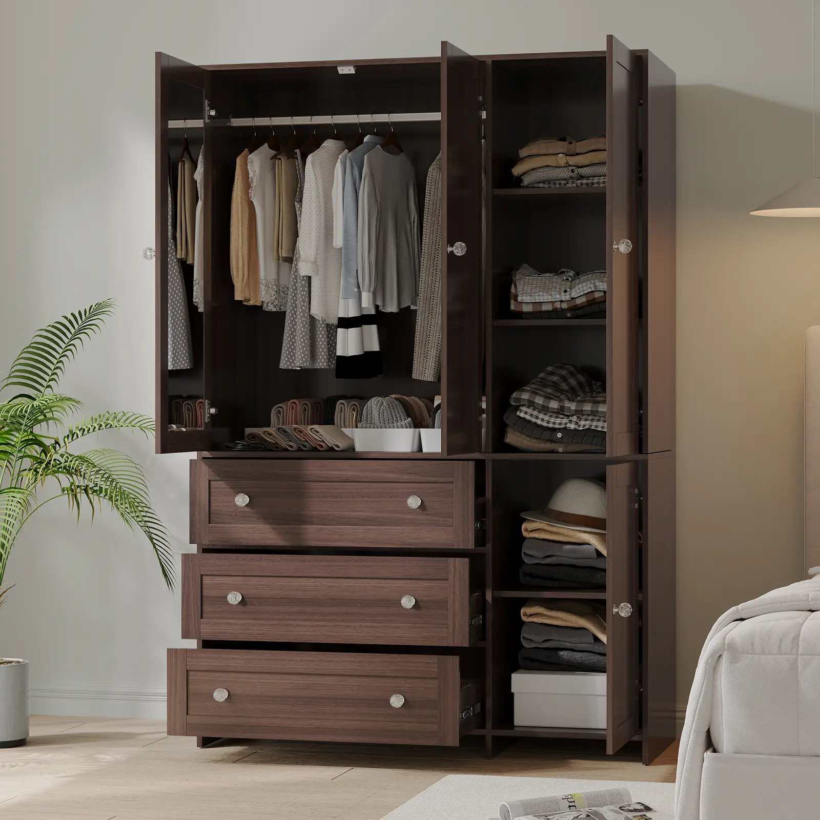 Maximize storage with a hanging area for suits/coats, 3-tier shelves for boxes/shoes, and a closed cabinet. 3 smooth drawers store socks/underwear, combining hanging and folding spaces seamlessly.
