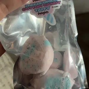 Light, crispy, cotton candy flavored taffy. Melts immediately in your mouth. Love the creamy texture and candy is always freash.