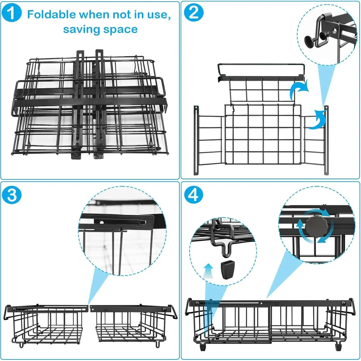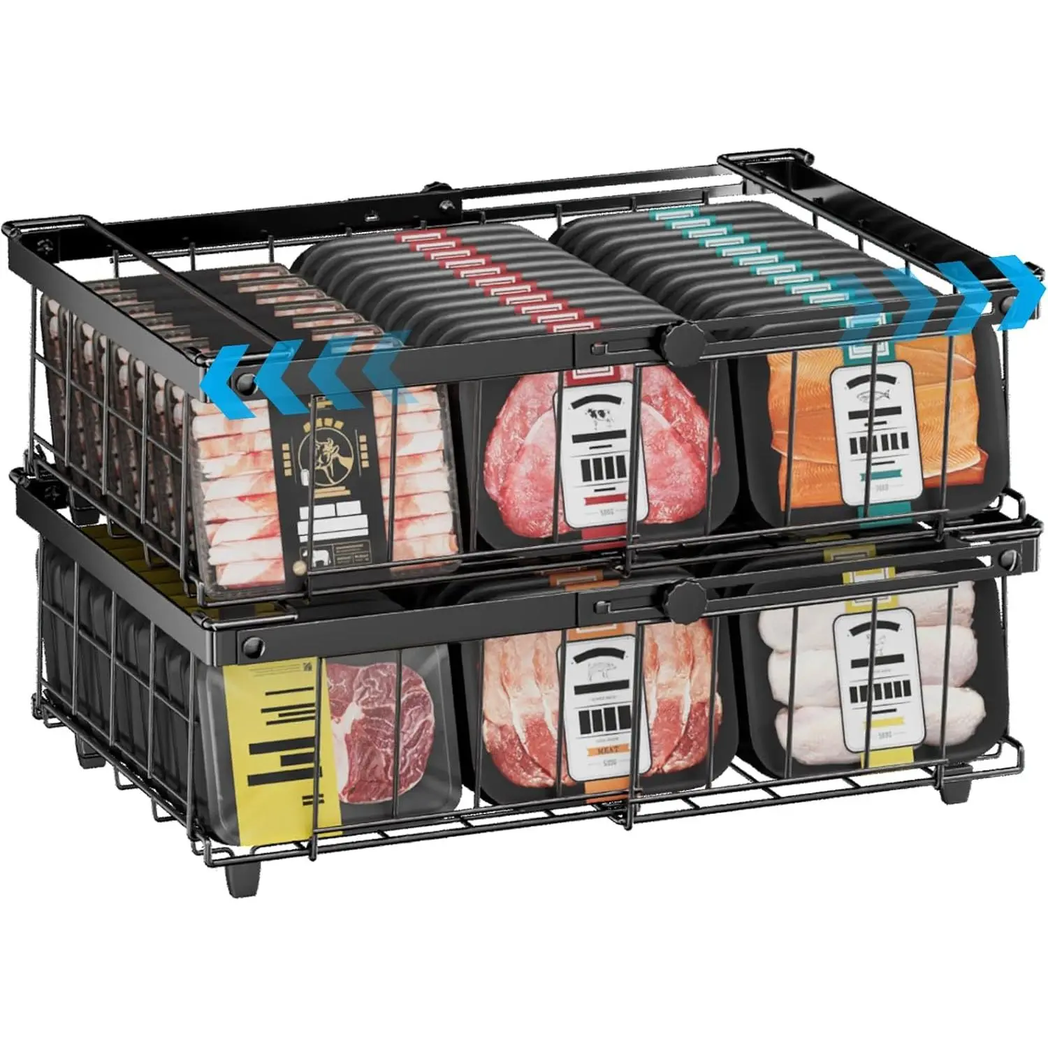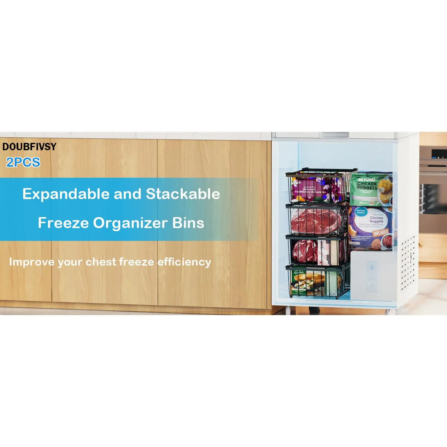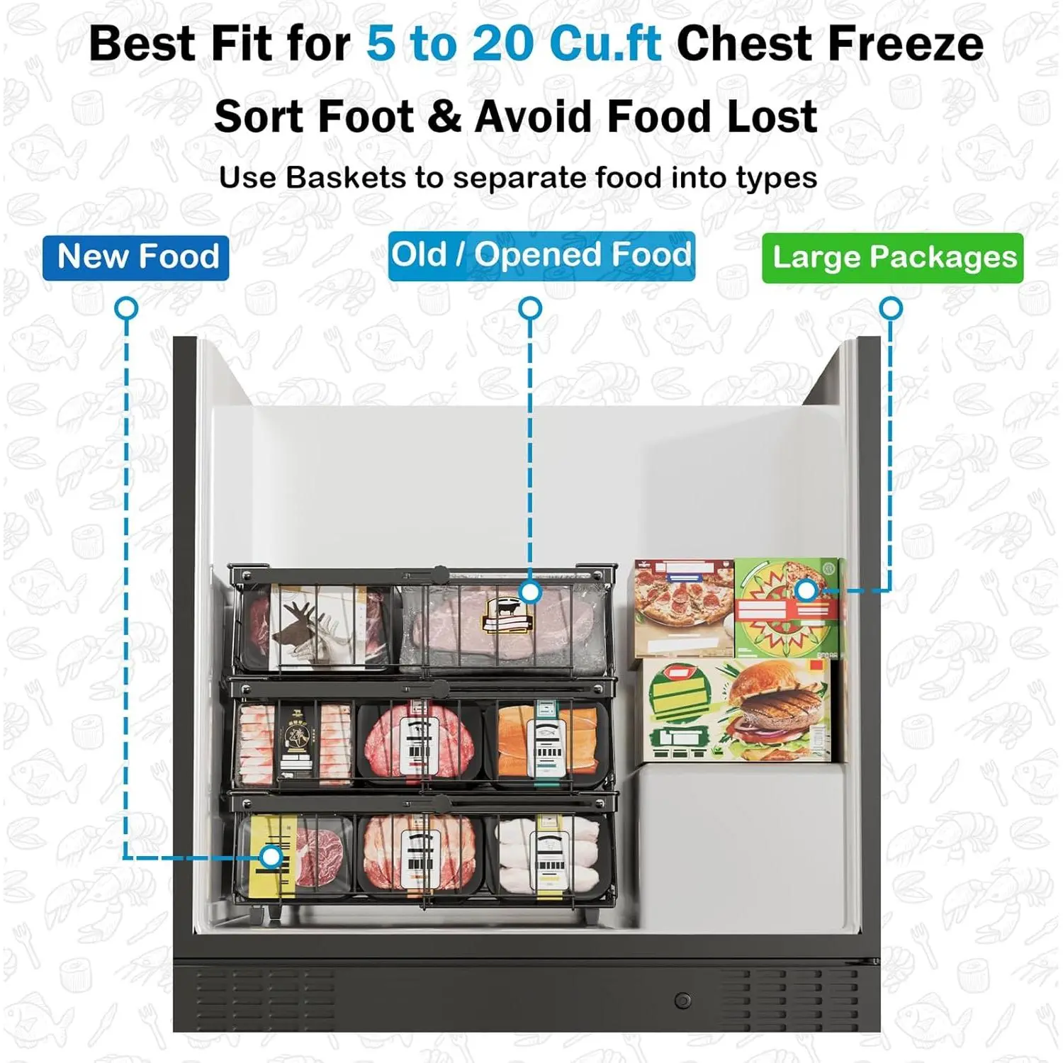 LARGE SIZE: The size of the large freezer organizer baskets is 11.4"(L) x 12"(W) x 5.1"(H), extended length is 17.8"(L) x 12"(W) x 5.1"(H), which is perfect for 5 to 20 Cu.FT freezer, can hold frozen foods packaged in multiple shapes.Provide rubber feet for the bottom layer to prevent scratching the freezer.The freezer organizer bins are adjustable in length, not only fits for chest freezer, but also for upright freezer.Please measure the size of your freezer before purchasingEFFICIENT FREEZING & HIGH QUALITY: Compared with the traditional plastic containers, this metal freezer storage container is made of open frames, which allows cold air circulation to better contact food, faster freezing for better freshness, preventing food from spoiling.Deep freezer organizer bins are made of antirust metal, which has good corrosion resistance and can effectively prevent rust and maintain a good condition even in a humid environmentEASY TO GET & REARRANGE: Fold down handles to stack the bins for chest freezer organization to fully use freezer vertical space.Freezer organizer easy to lift and rearrange, no need to dig everything and won't freeze your fingers.When you need to get foods from bottom, you have to do is lift the chest freezer basket out to see what’s underneath, instead of taking things out one by one.When not in use, the stackable organizer bins can be folded and stored without taking up spaceHOLD HEAVIER FOOD NOT DEFORMED: The 20% thicker black coated wireline and rounded edges of the freezer storage can hold more heavy frozen food and prevent scratching or tearing of bags or wrapping.You can easily see the food of Freezer organizer Bins at a glance, making it convenient for you to retrieve food and saving you time searching for foodNO WASTE OF FOOD: Multiple deep freezer organizer bins can sort and organize all kinds of meat, fish, bagged vegetables, put the new food in the bottom, old or opened bags at the top, first in first out to avoid food lost and expire. Convenient for us to find food, providing convenience. You can put more stuff down in your freezer after using our freezer bins