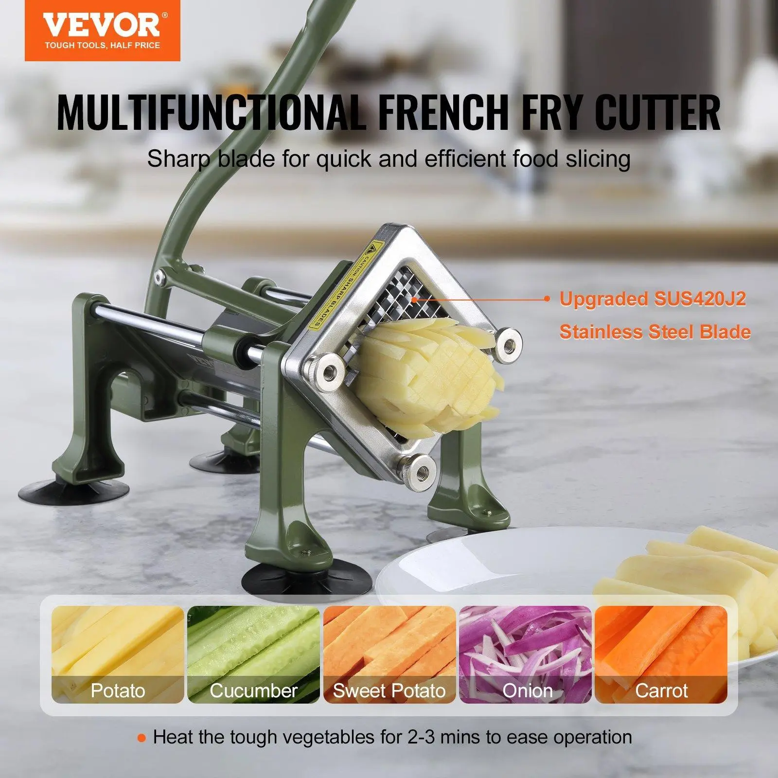 ·Durable Blades: Our french fry cutter utilizes upgraded food-grade 420J2 stainless steel blades in 1/2 inch and 3/8 inch sizes, enabling effortless cutting of vegetables like potatoes, carrots, cucumbers, and even tougher vegetables like sweet potatoes.
