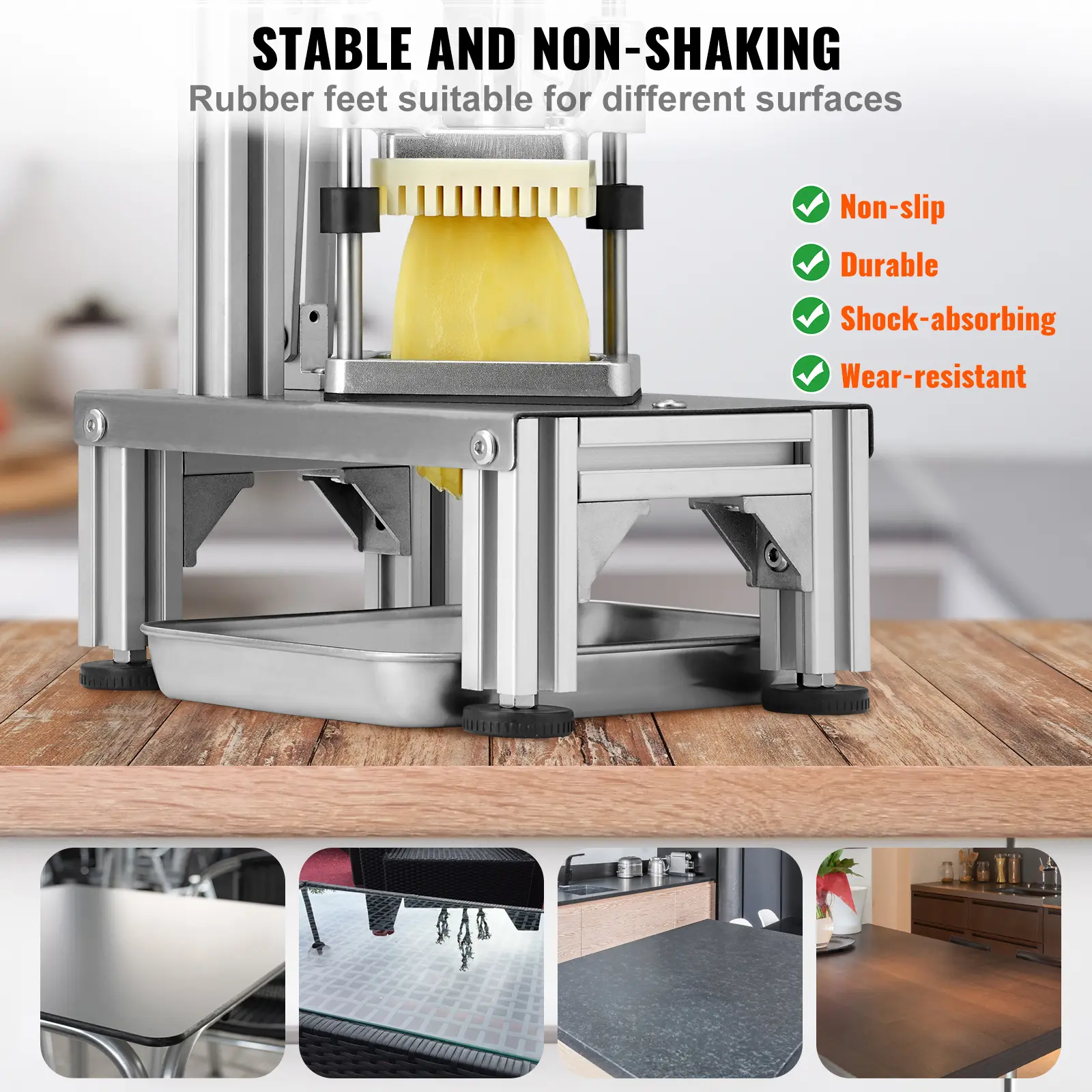 • Good Stability & Easy Cleaning: The four non-slip feet of the potato dicer are wear-proof, solid, shock-absorbing, non-slip, and odorless, which ensures stability and performance during operation. The blades and push block are both removable and washable, easy to clean and maintain.