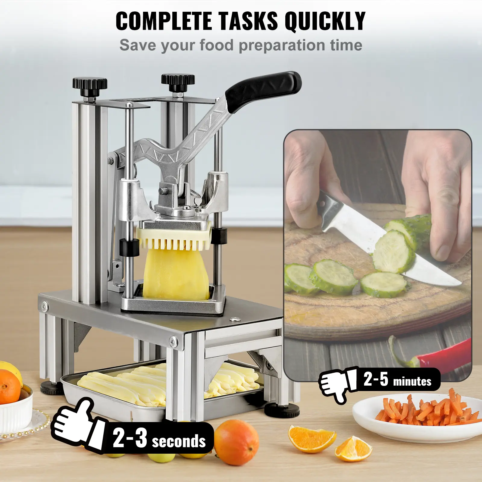 • Multipurpose Vegetables Fruits Chopper: The heavy-duty chopper is very suitable for restaurants and home kitchens. It can be used to cut potatoes, carrots, cucumbers, apples, pears, and other vegetables and fruits. It is ideal for those who want to prepare vegetables and fruits for salads, French fries, and desserts conveniently and quickly.