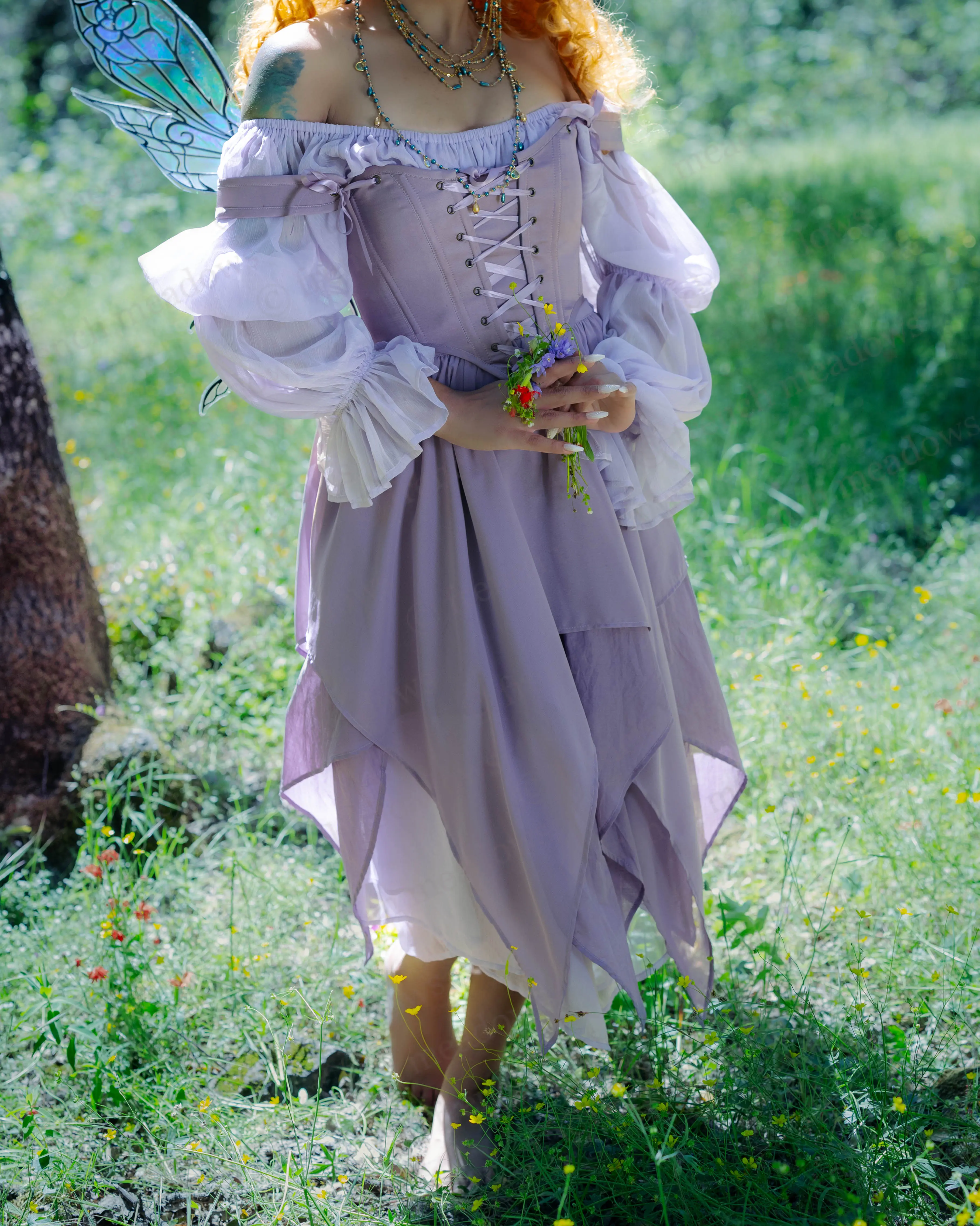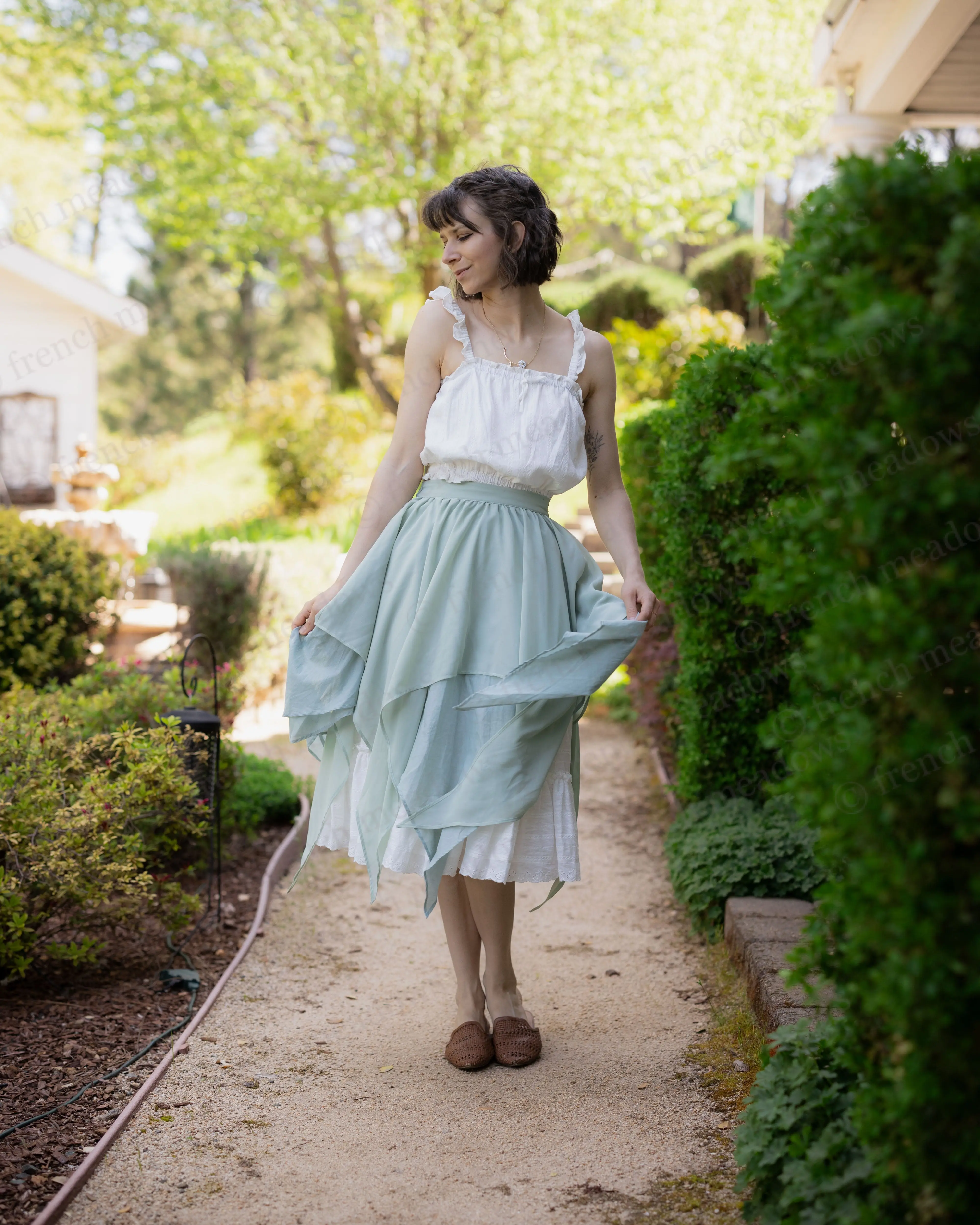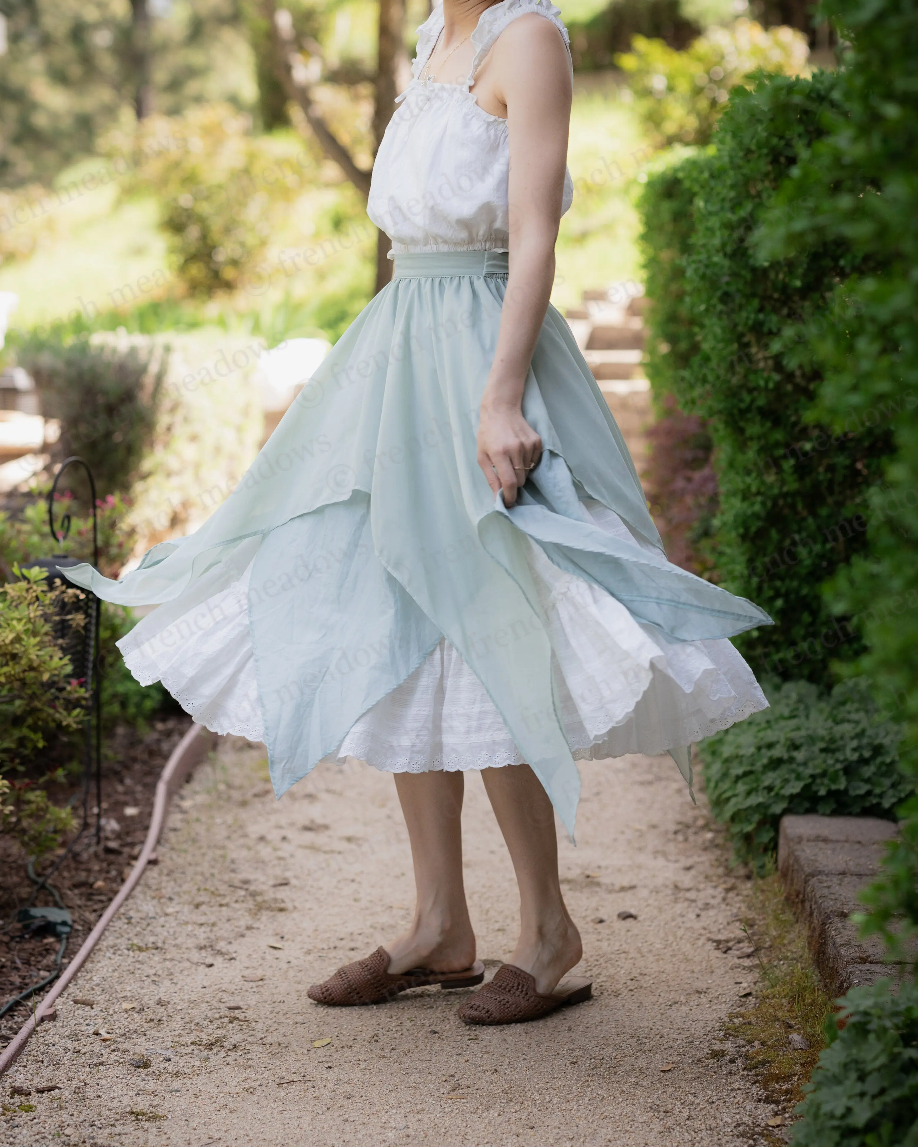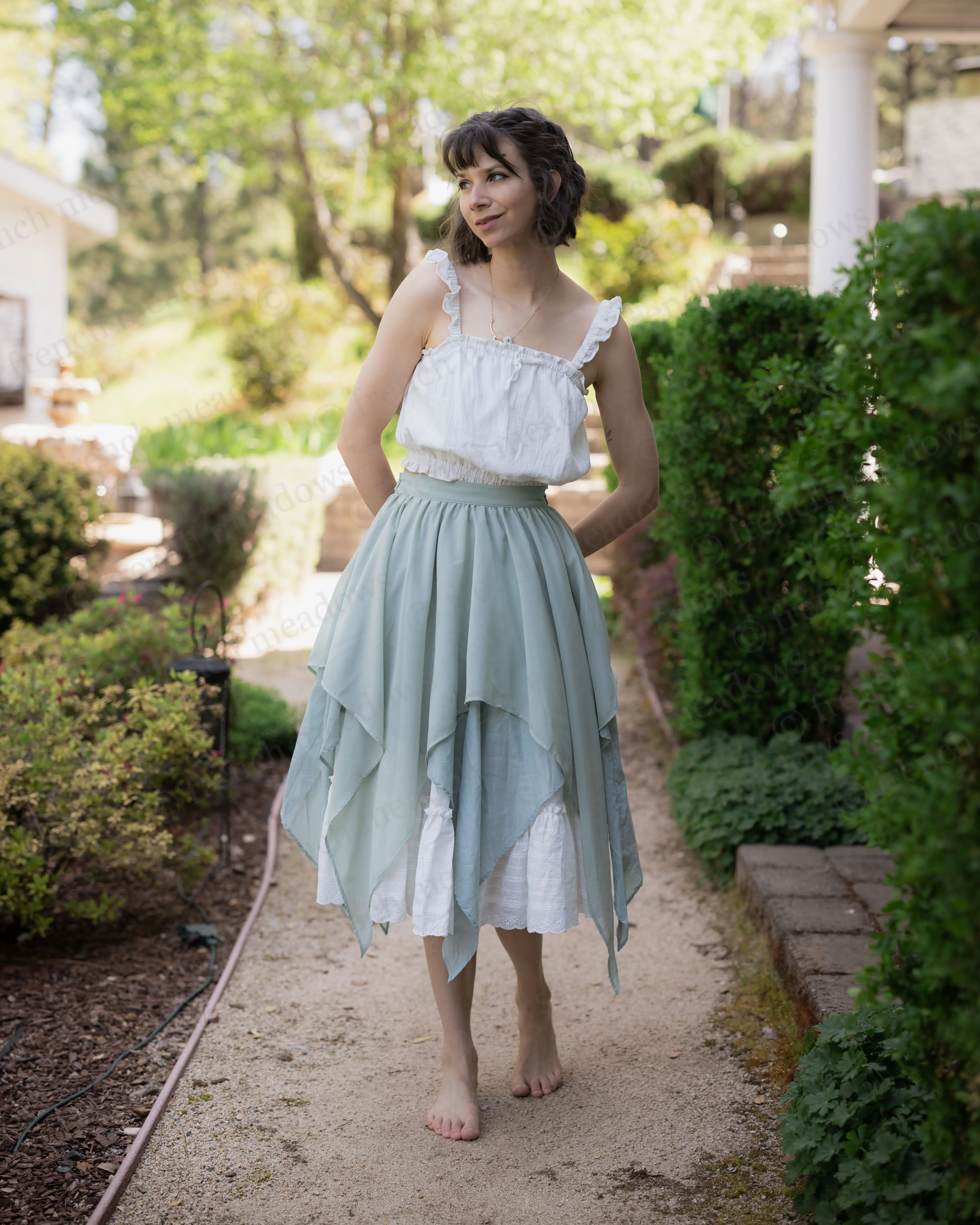 Plucked straight out of a fairytale garden and dipped in dew, our Flower Fairy Skirt is a whimsical staple for any fairy costume or breezy spring outfit. Featuring a layered circle skirt with a pointed handkerchief hem, this skirt will have you twirling about the gardens or your next renaissance faire. A delicately sheer chiffon top layer gives this skirt natural whimsy, while the 100% cotton lining provides coverage as well as comfort next to your skin. A back elastic waistband and adjustable waist ties make this skirt easy to tailor the fit to your waist. Layer this skirt over our Flutter Fairy Dress for an even more whimsical faerie look.