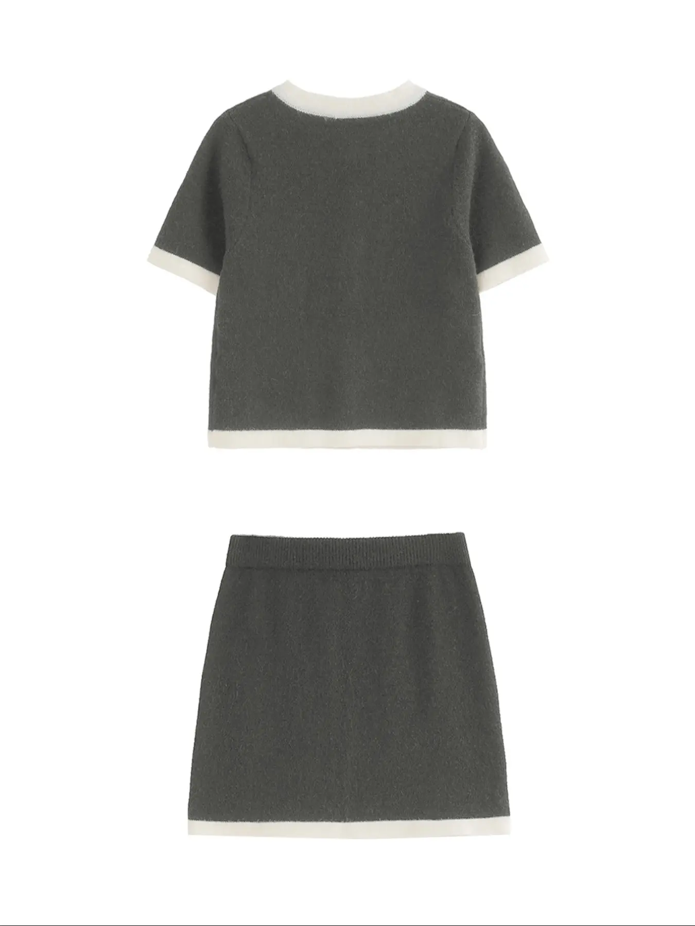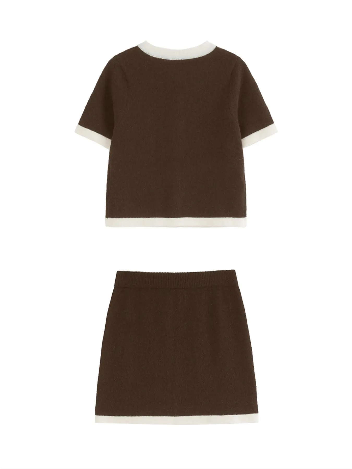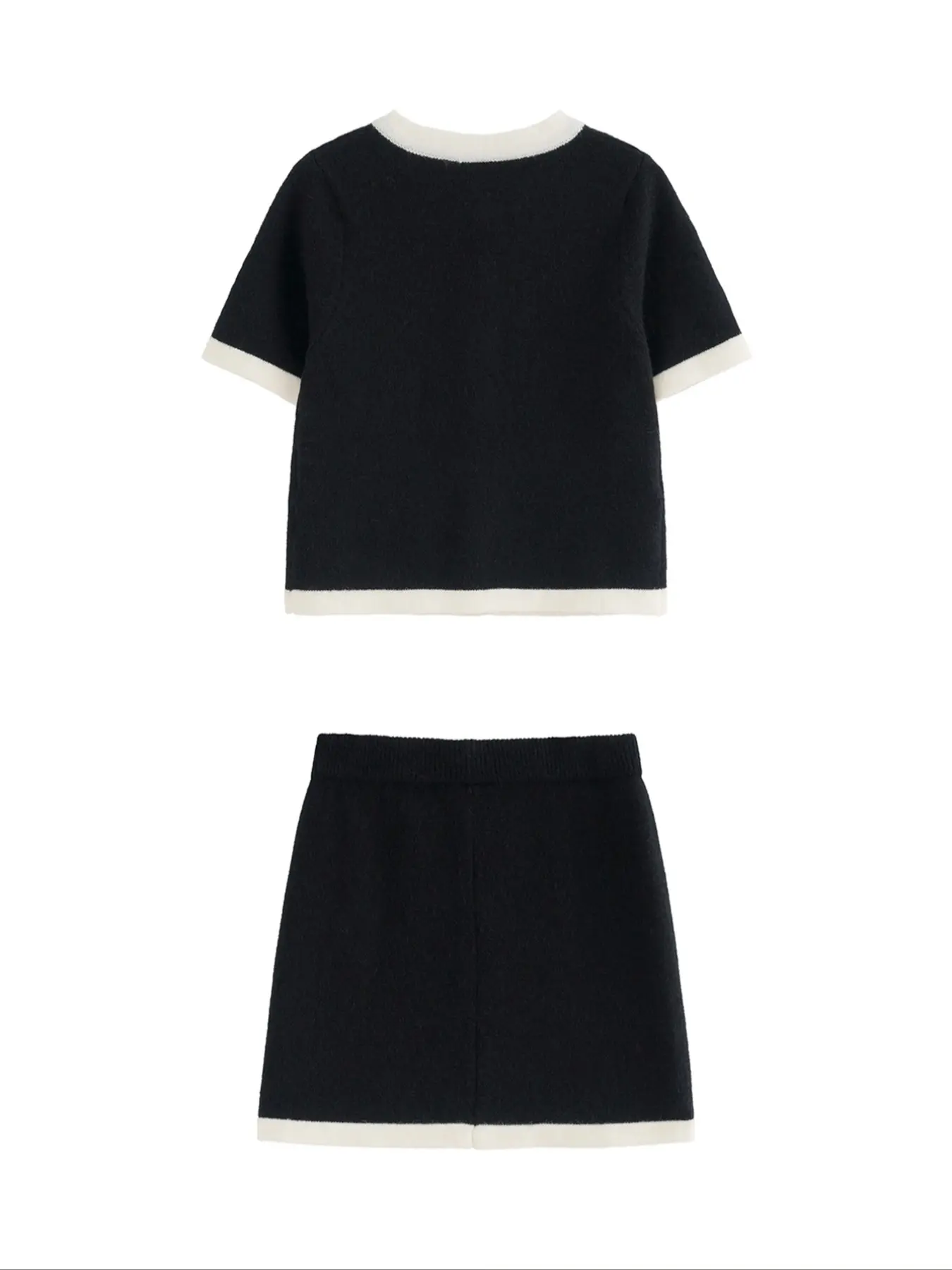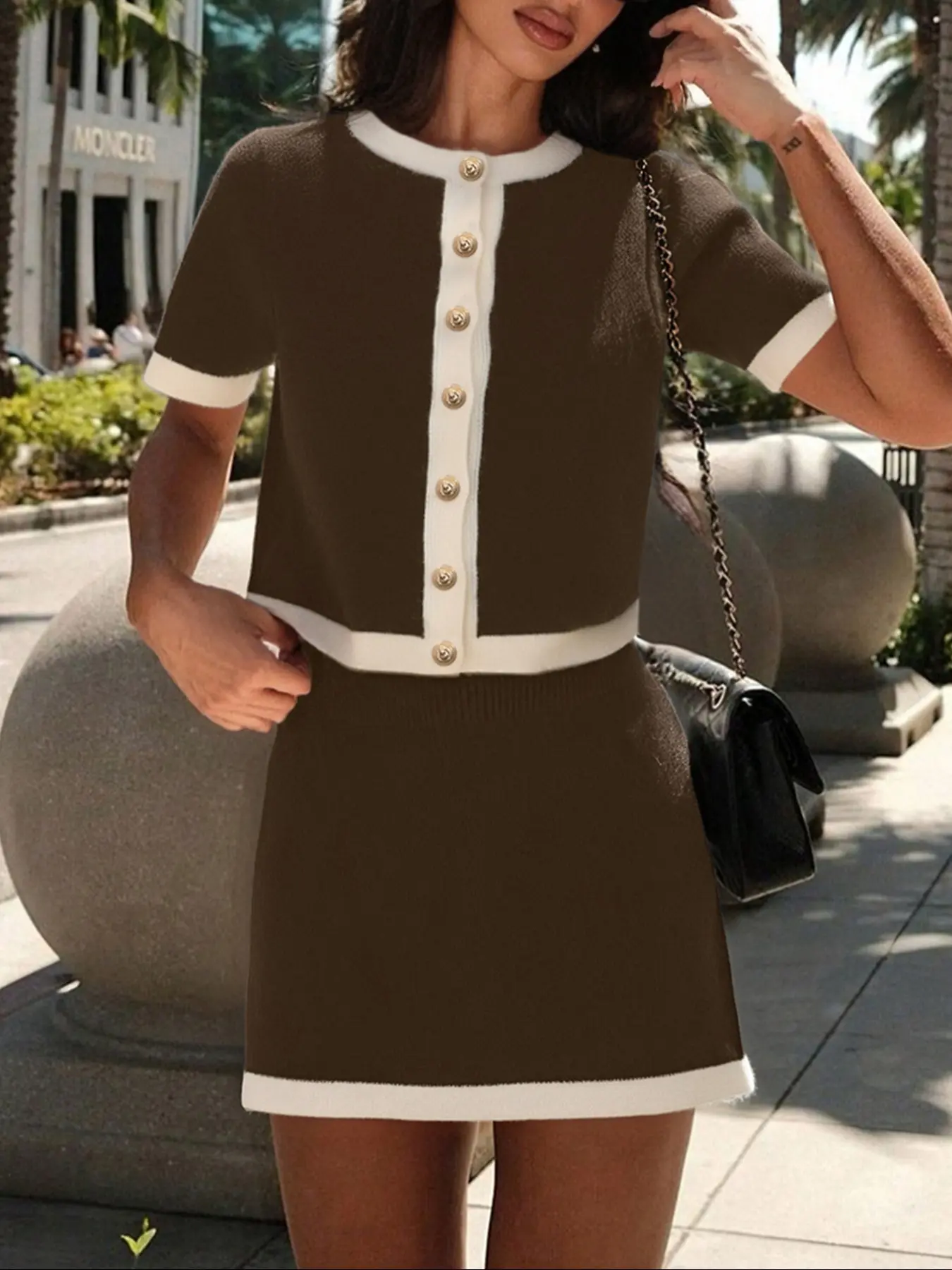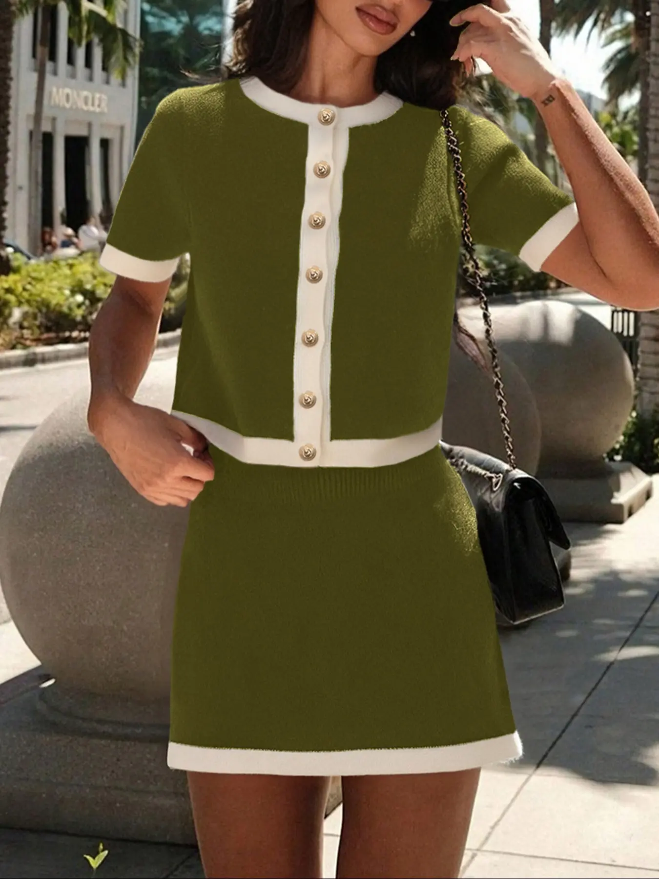 5. Women's French Style Elegant Commuter Set, Colorblock Knit Fitted Round Neck Cardigan and Half Skirt Two-Piece, Casual Summer