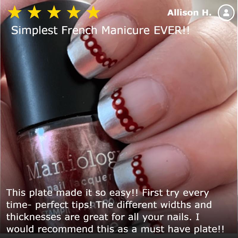 Free-handing a french manicure can be a pain in the a**, but Pardon My French (m052) makes classy manicures easy AF. This stamping plate features a variety of french tip designs, basic shapes, and a convenient gradient block designed to fit nearly any nail.  Give your nails a modern twist with accented shapes. Use the gradient full-nail pattern to create beautiful fades without wasting sponges. Mix and match your french tip designs with a variety of stamping polishes to add your creative touch. The possibilities are endless.  For longer nails, line up the bottom curve of a french design with the natural curve of skin beneath your nail bed. Next, paint the rest of your nail tip with the same polish color.