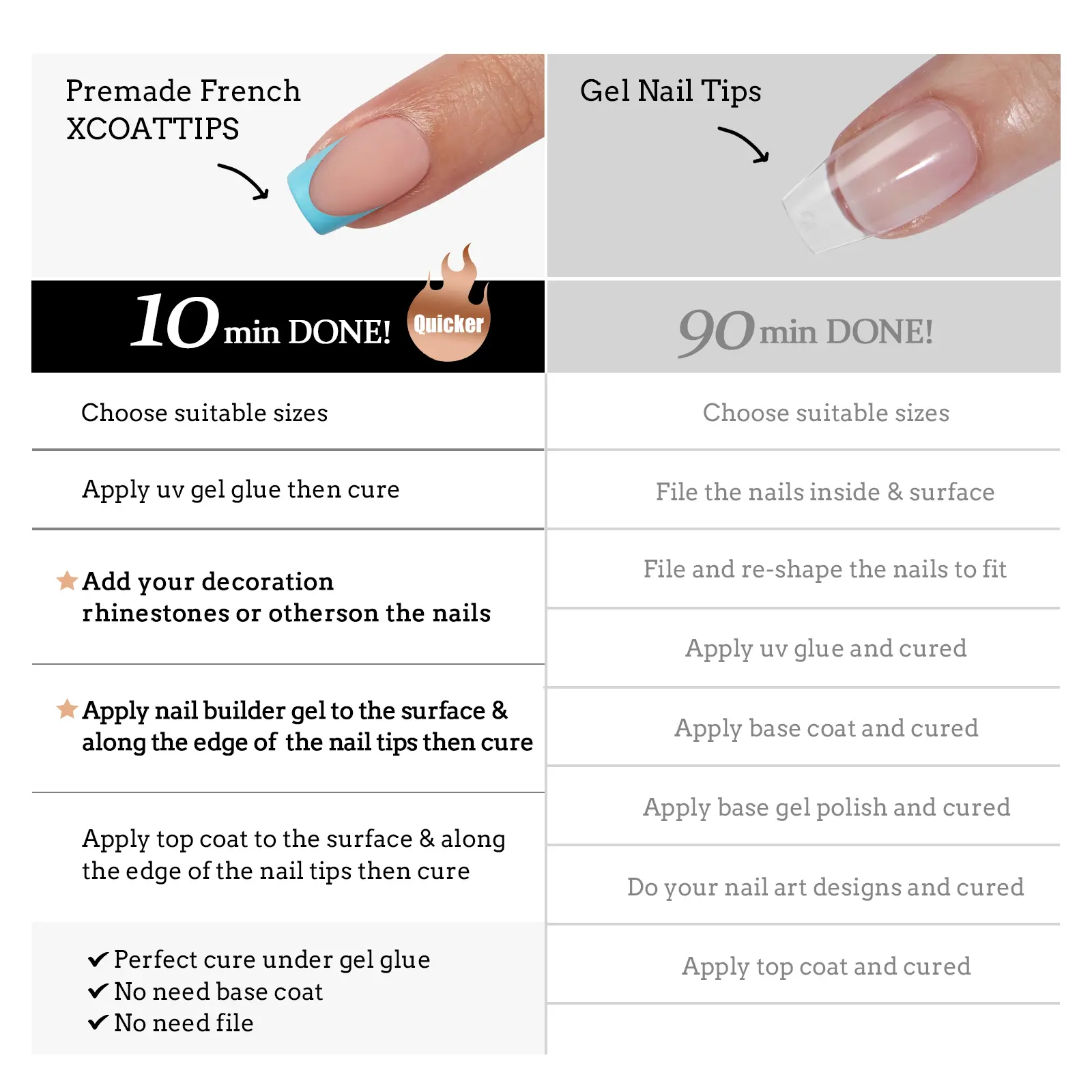 Super easy instructions and application, Nails lasts me at least 2 weeks, Nails are not flexible, they are like a thick plastic, Super good quality, Glue is easy to work with, Not messy, Lasts a long time.