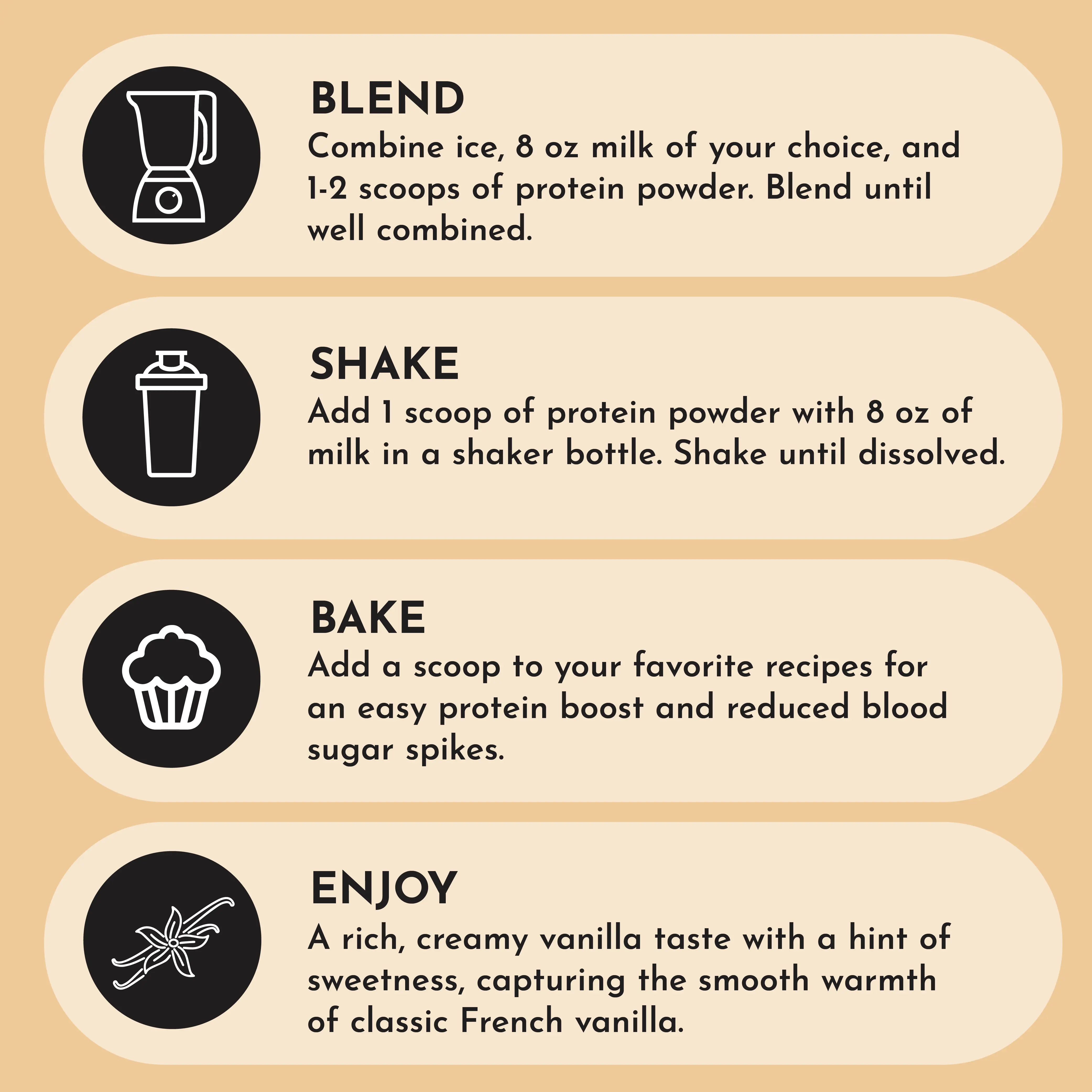JI has the best protein & French Vanilla is in my top 3 flavors. The flavor is very smooth. It mixes easily without clumps and adds a subtle vanilla taste. Works very well in smoothies, iced coffees, and baked dishes!