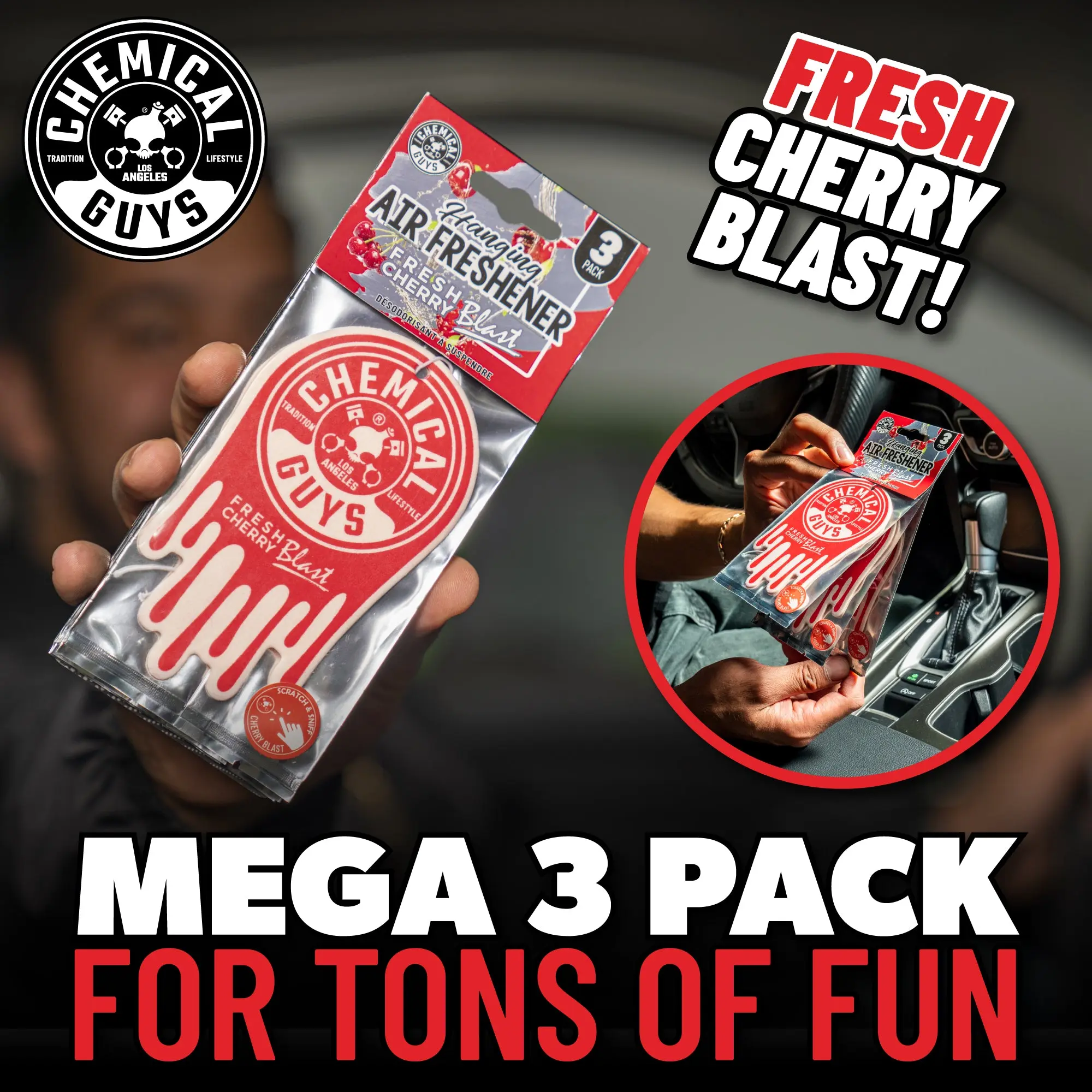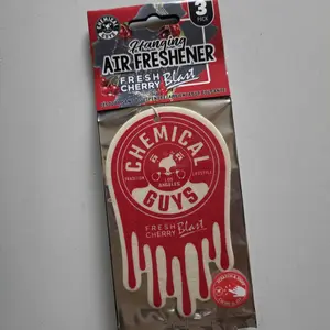 5. CHEMICAL GUYS Fresh Cherry Blast Hanging Air Freshener 3-Pack – Sweet & Tangy Cherry Scented Hanging Fresheners for Cars, Homes & Offices, Long-Lasting Scent with Iconic Dripping Logo Design, Car Air Freshener