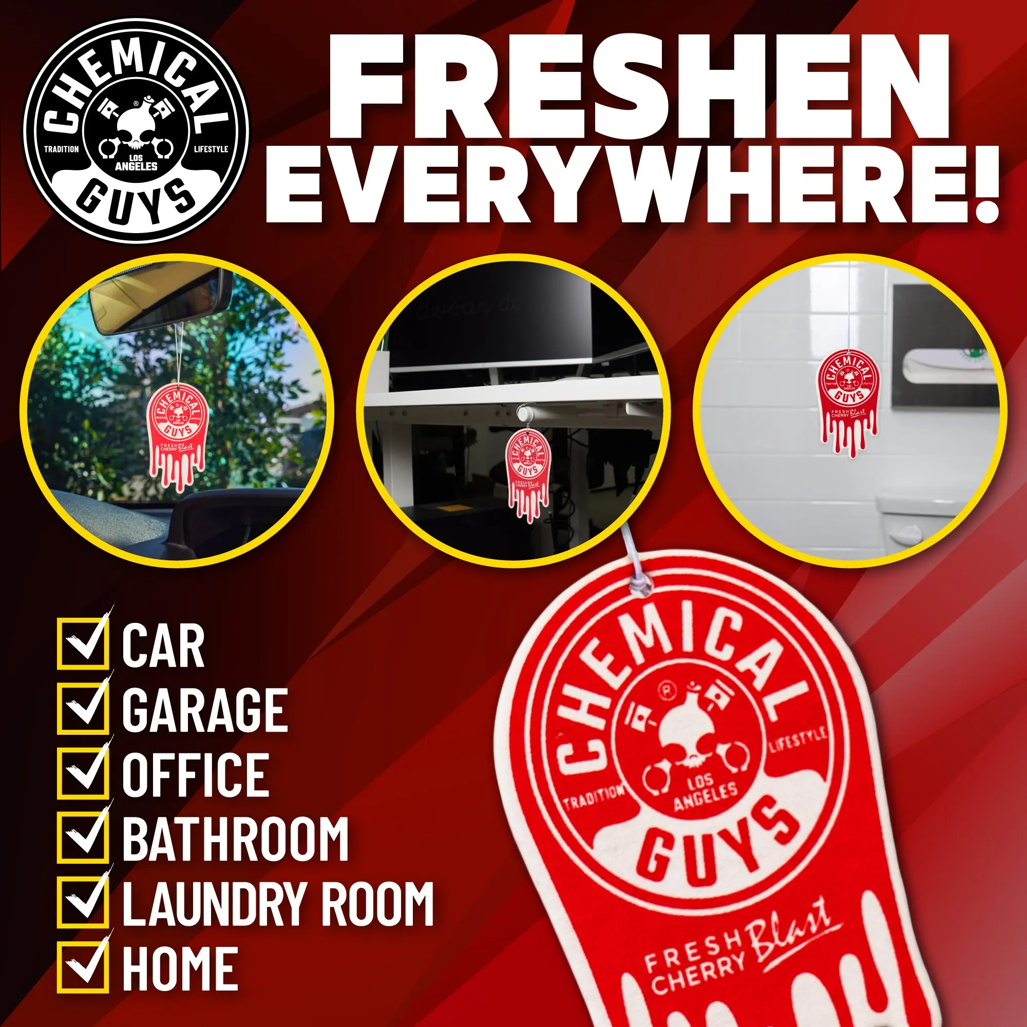 CHEMICAL GUYS Fresh Cherry Blast Hanging Air Freshener 3-Pack – Sweet & Tangy Cherry Scented Hanging Fresheners for Cars, Homes & Offices, Long-Lasting Scent with Iconic Dripping Logo Design, Car Air Freshener