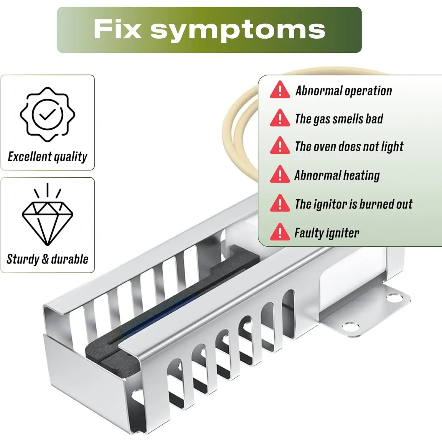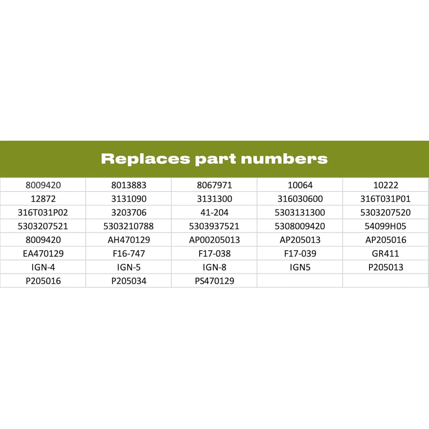 highquality replacement for Frigidaire Burner Igniter (5303935066) ignites gas to light burner. It comes with two ceramic wire connectors and replaces following part numbers: 08009420, 08013883, 08067971, 10064, 10222, 12872, 3131090, 3131300, 316030600, 316T031P01, 316T031P02, 3203706, 41204, 5303131300, 5303207520, 5303207521, 5303210788, 5303937521, 5308009420, 54099H05, 8009420, AH470129, AP00205013, AP205013, AP20501 For safety, use protective equipment and disconnect appliance from utilities before servicing. Consult your owner's manual to verify part numbers and for detailed instructions, as some repairs may require a trained. From Manufacturer: Replacement for Frigidaire 5303935066 Igniter for Range with 18inch leads. This part is compatible with following models: Replacement for Frigidaire 30227223/07, 3030530004, 3030532303, 3030532304, and 3036586603. Genuine Replacement Part.