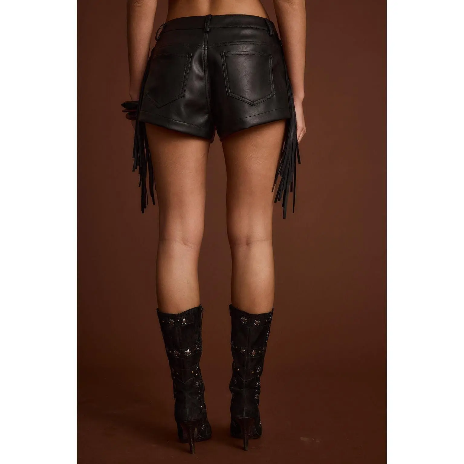 The Steele Black Vegan Leather Fringe Shorts are for the bold and unapologetic. With bold fringe that sways with every step, these shorts blend Western grit with It-girl glam. Perfect for festivals or nights that call for making moves, pair them with a crop top, boots, and your fiercest attitude.