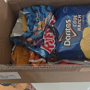 The Doritos bag was open in the box. They are stale because of it! There's nothing but crumbs in the bag. I was really looking forward to this flavor. The other 2 bags seem unscathed. Seriously disappointed. This is the first time I've ordered from you.