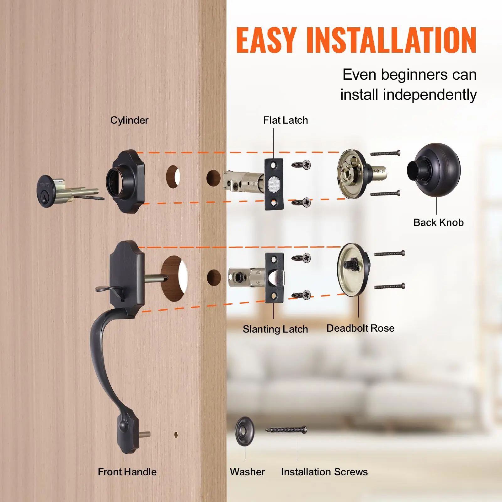 • Install with Ease: This front door handle is easy to install, and you don't need a professional door installer. Simply follow the 5 steps in the instruction manual: 1. Mark the door and drill holes; 2. Install the lock latch; 3. Attach the external handle; 4. Install the internal knob; 5. Attach the lock strikes. With just a screwdriver, you can complete the installation in minutes.