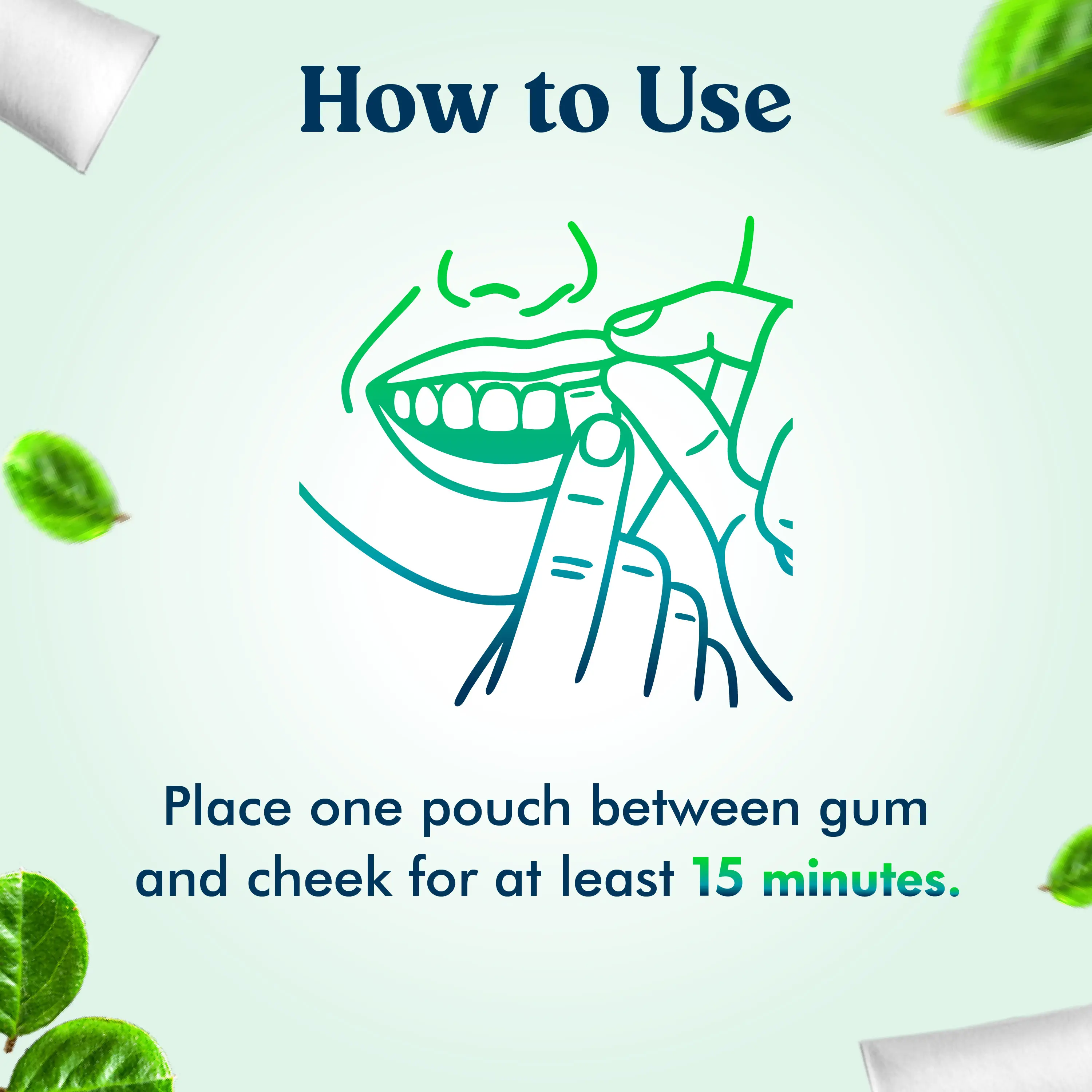 Place one pouch between your gum and lip for at least 15 minutes, enjoy the flavor, and remove after desired use time.