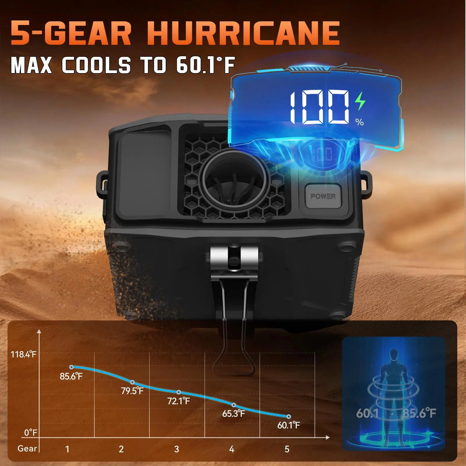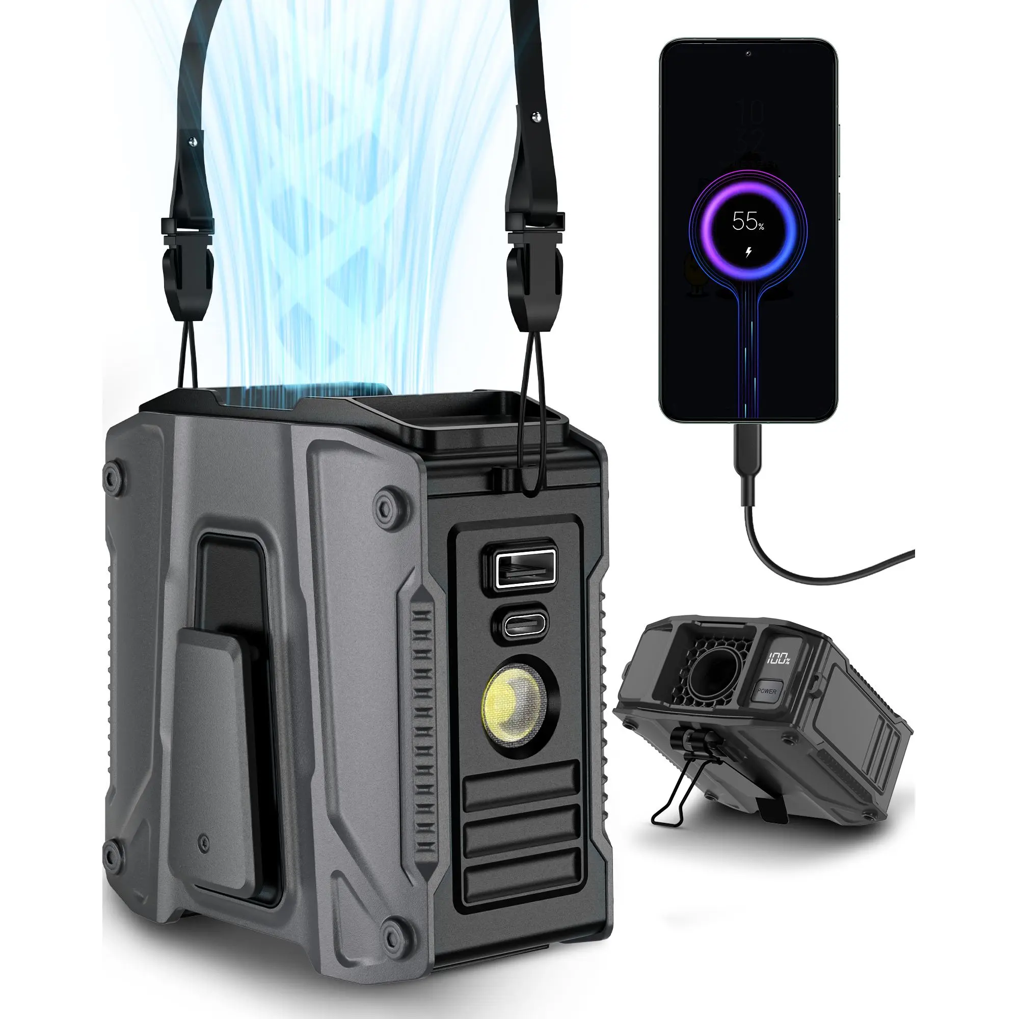 The fan is awesome. 10 different speeds blows hard keeps you cool the metal clips are awesome. Very tough not gonna break perfect for the construction field that I’m gonna use it for. and the LED light on it bright as hell and you can charge your phone while staying cool and seeing the dark