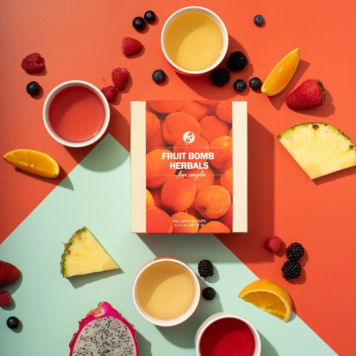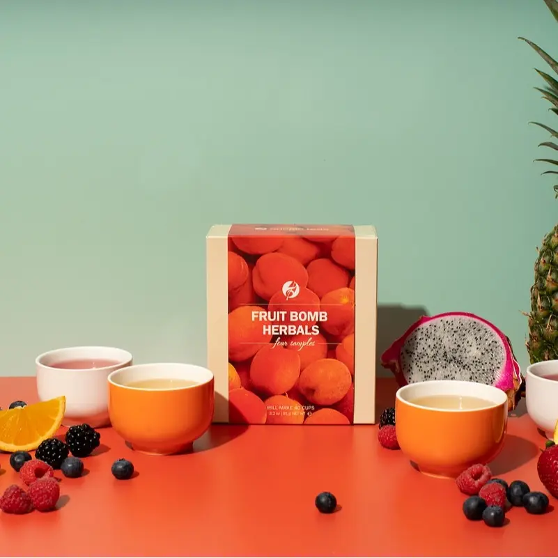These four fruity flavors in our Fruit Bomb Sampler Set will satisfy your taste buds without keeping you up at night. Each set contains four sample sizes of loose tea, totaling 3.2 oz and making 40 cups.