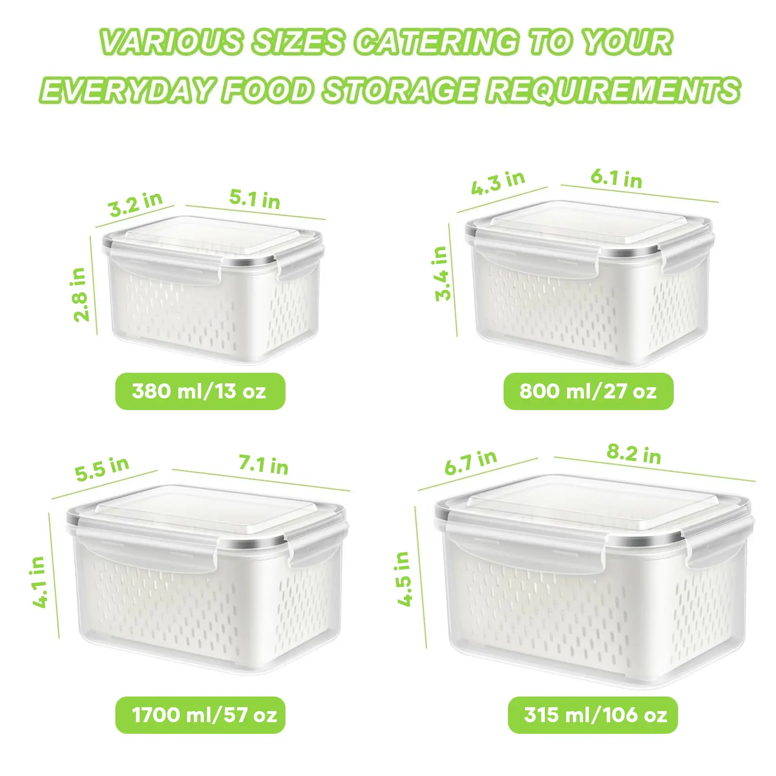 Receive 4 uniquely sized fridge organizers paired with 4 matching colanders. Use the colanders inside the containers or separately. Sizes range from 0.3 L to 3.15 L (0.6 - 6.7 pt / 0.3 - 3.15 qt). Perfect for storing berries, fruits, vegetables, and meats.