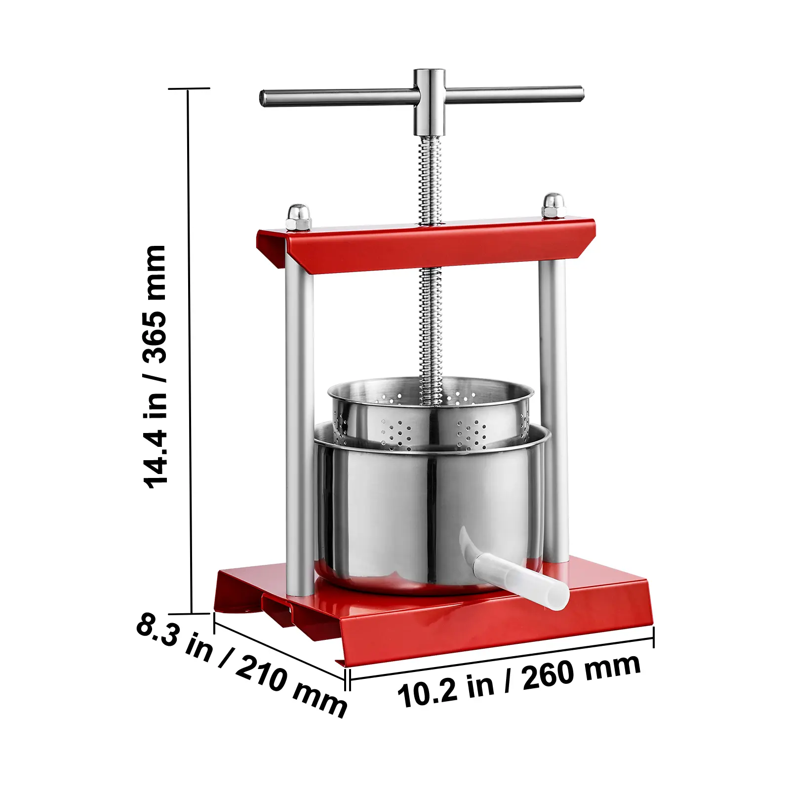 • Built Like a Champ: The press plate, inner barrel, and outer barrel are made of food-grade stainless steel, ready for the long haul and standing up to corrosion and wear. With a metal base and bracket, this fruit and wine press ensures stability and impact resistance. FDA-certified, it's a tough cookie that prioritizes your security.