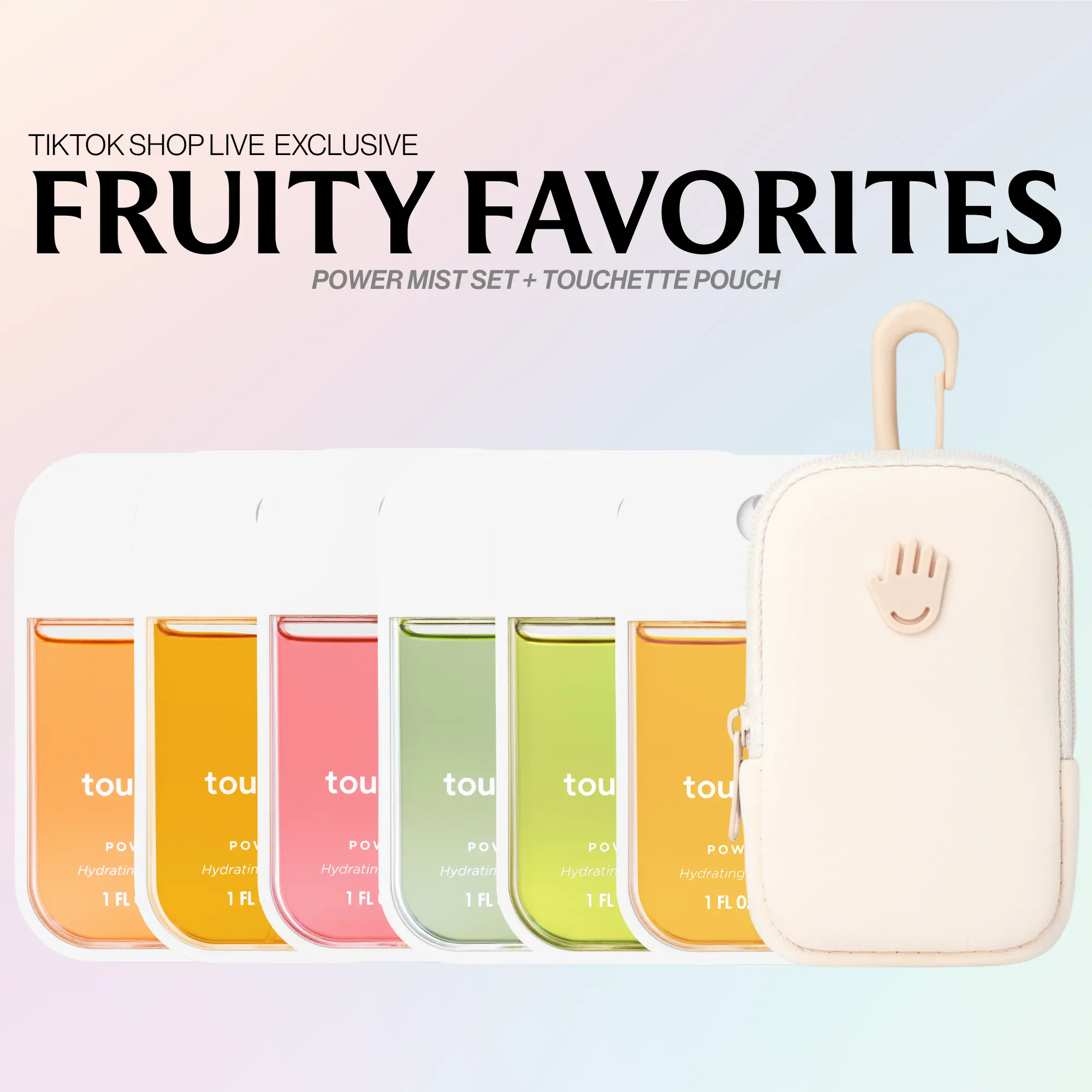 A TikTok Shop exclusive set featuring a curated selection of Touchland Power Mist hand sanitizers with fruit-forward scent profiles, paired with a Blush Touchette Pouch for portable storage.