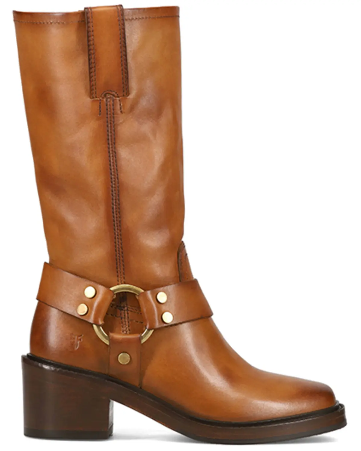 Leather upper. Rubber outsole. Leather lining. Pull-on style with pull tabs. Square toe. 11" shaft height. 2" block heel. Harness accent at ankle. Solid brown design. Imported.